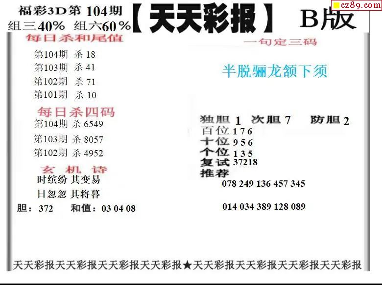 福彩3D2026104期天天彩报A版 天天彩报B版