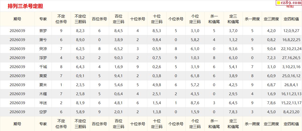 26年039期彩宝贝专家体彩P3杀号定码图表
