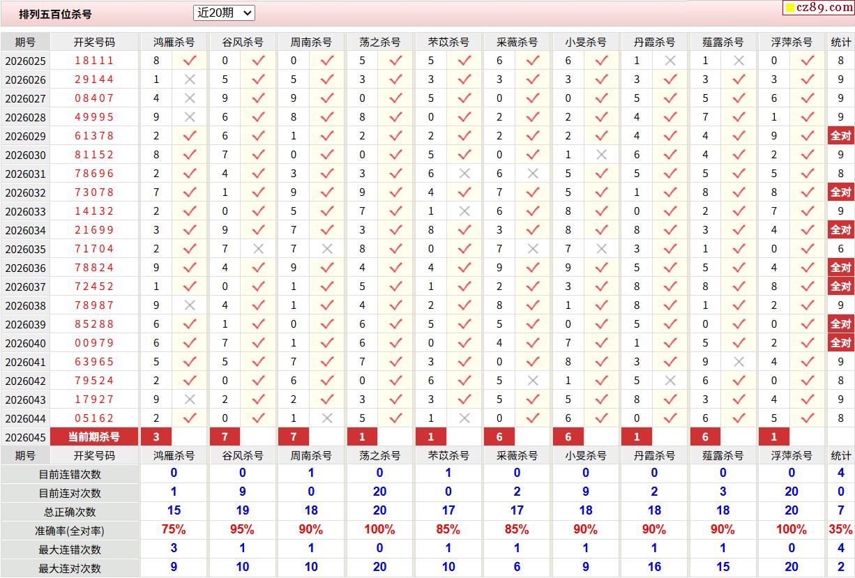 26年045期彩宝贝专家体彩P3杀号定码图表