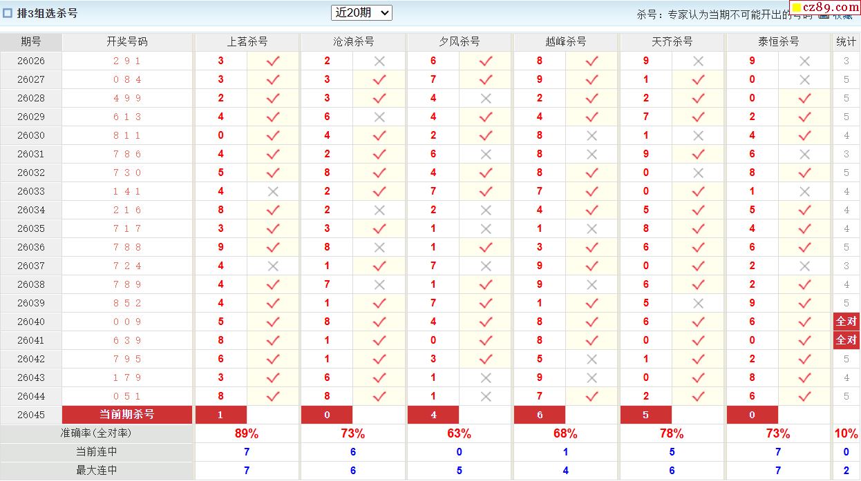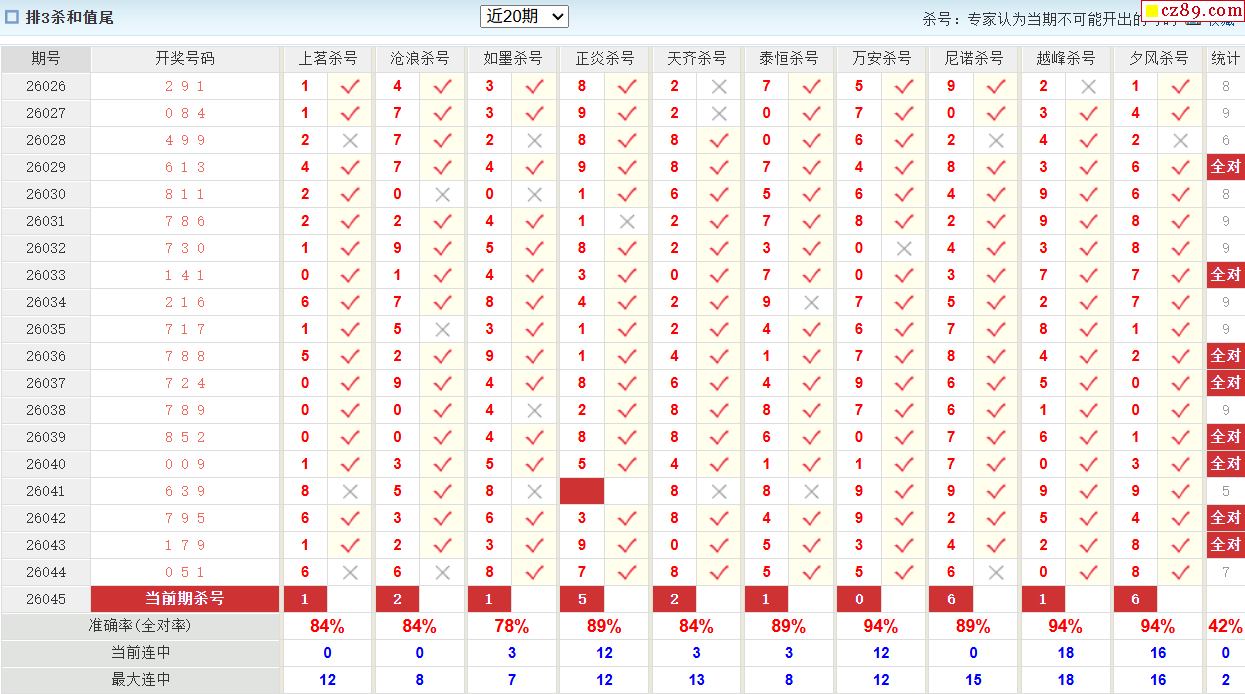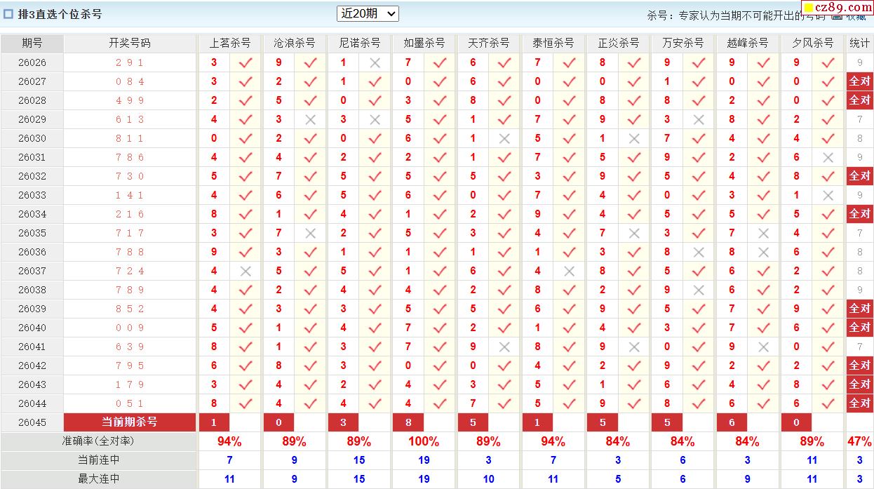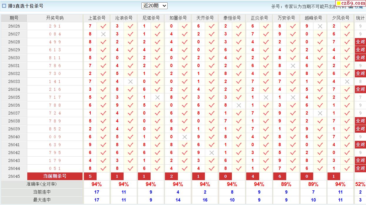 26年045期彩宝贝专家体彩P3杀号定码图表