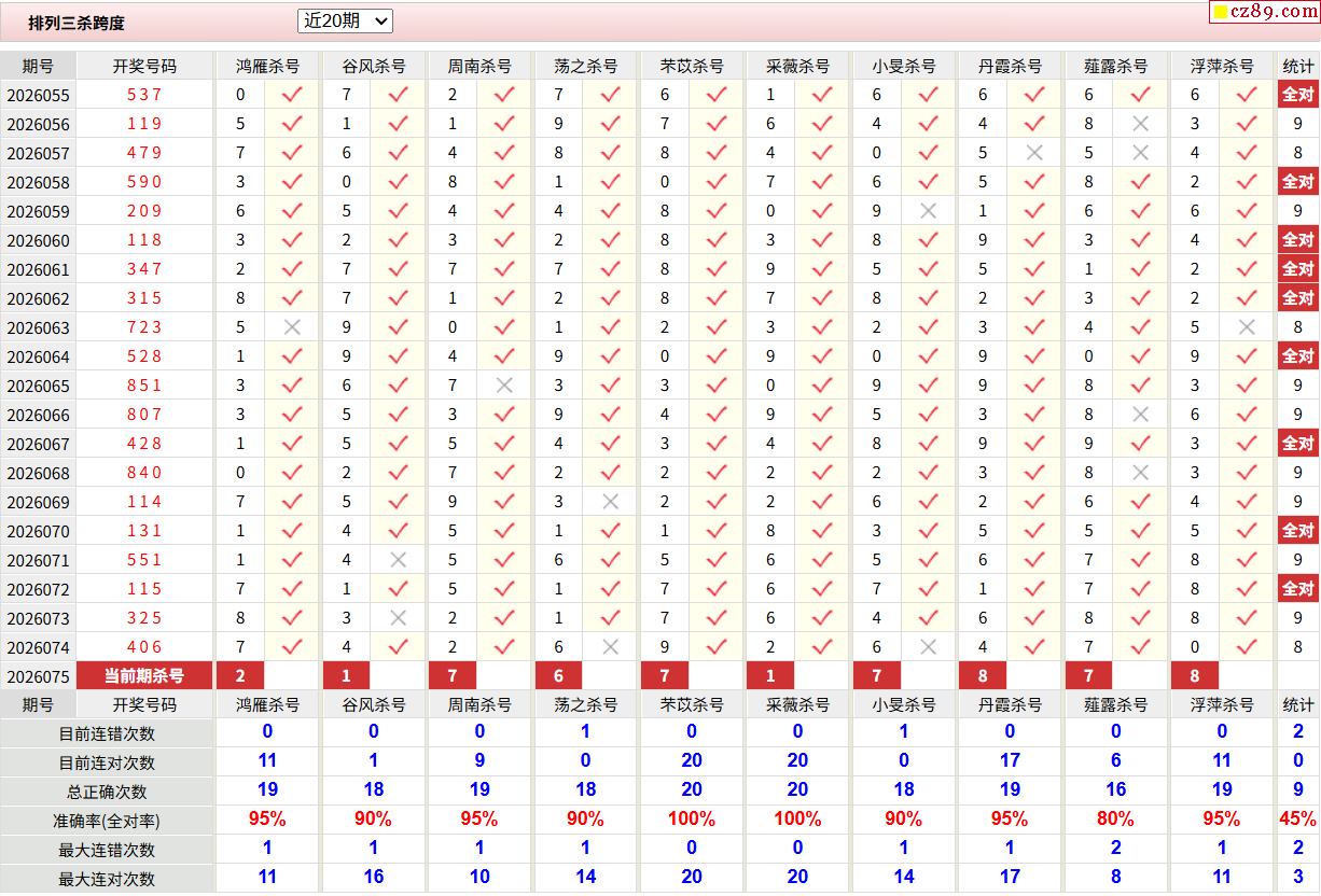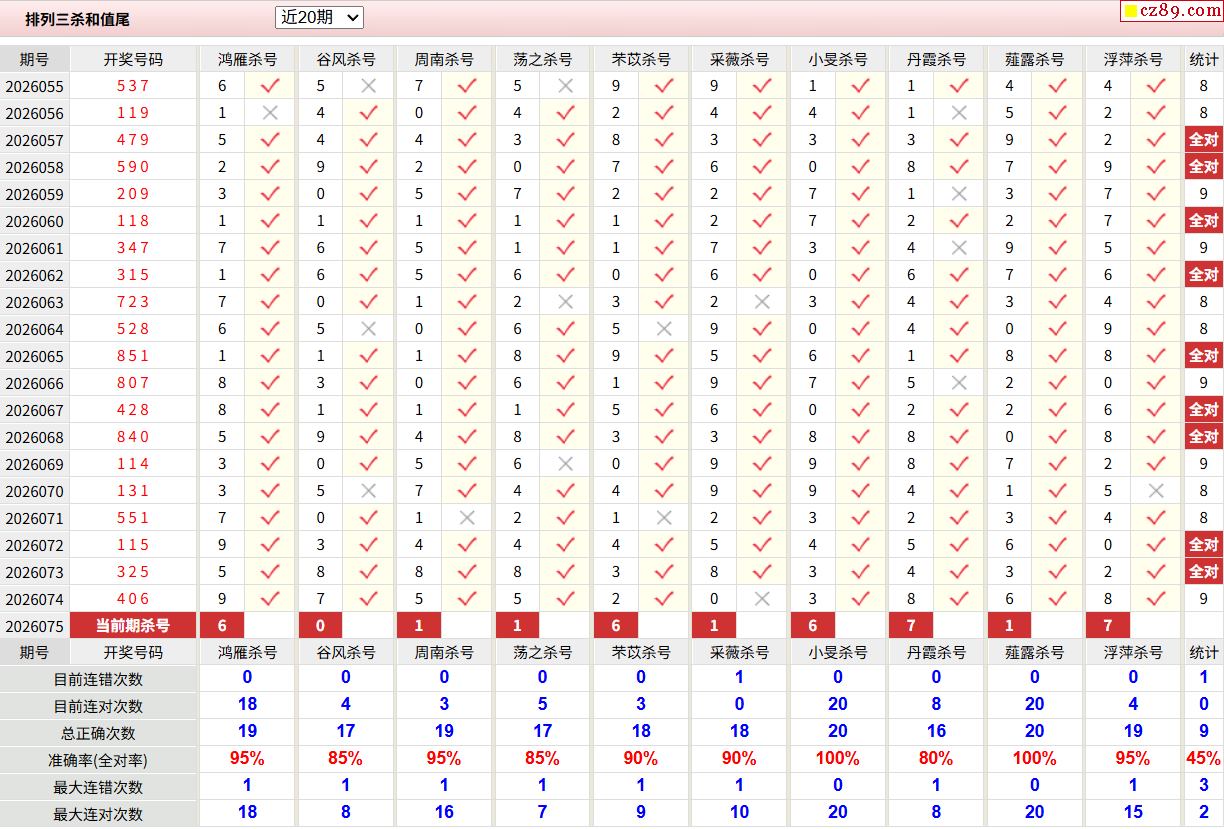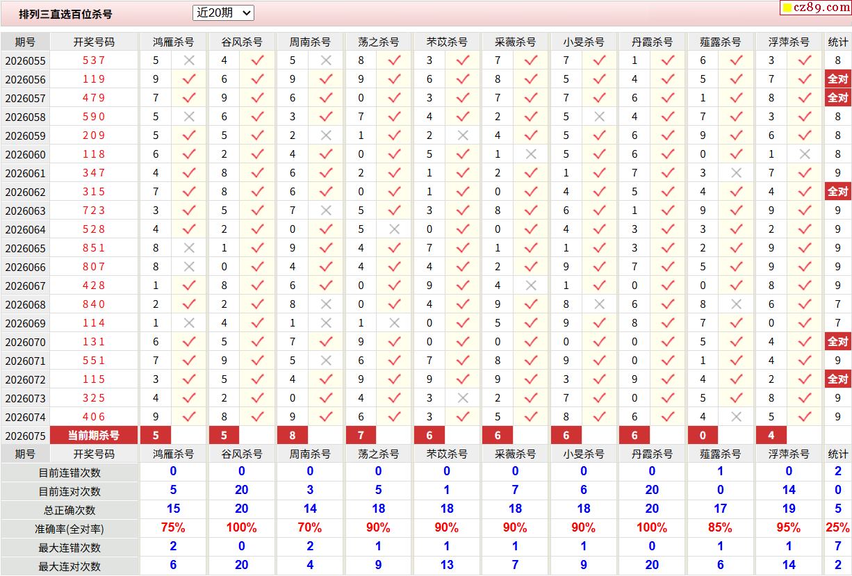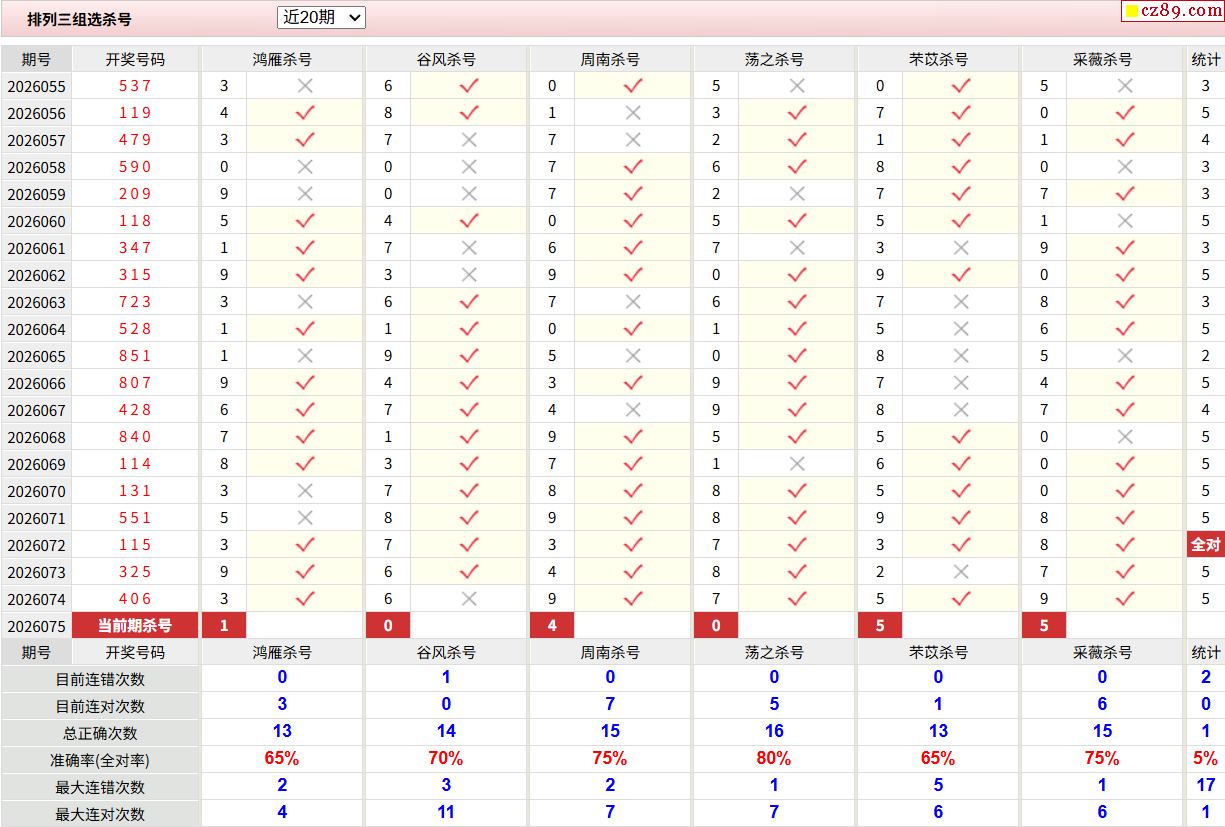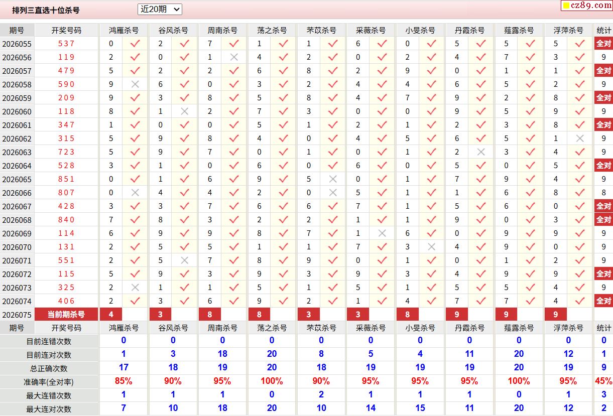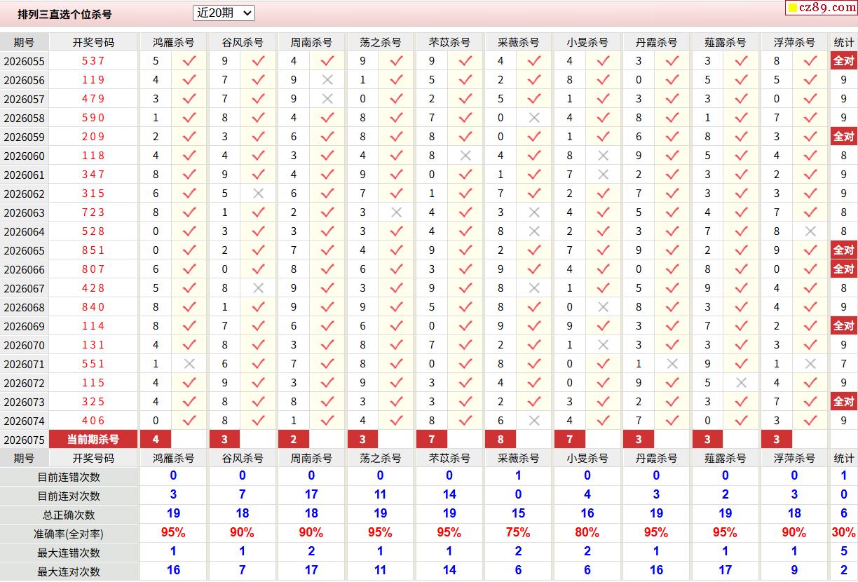 26年075期彩宝贝专家体彩P3杀号定码图表