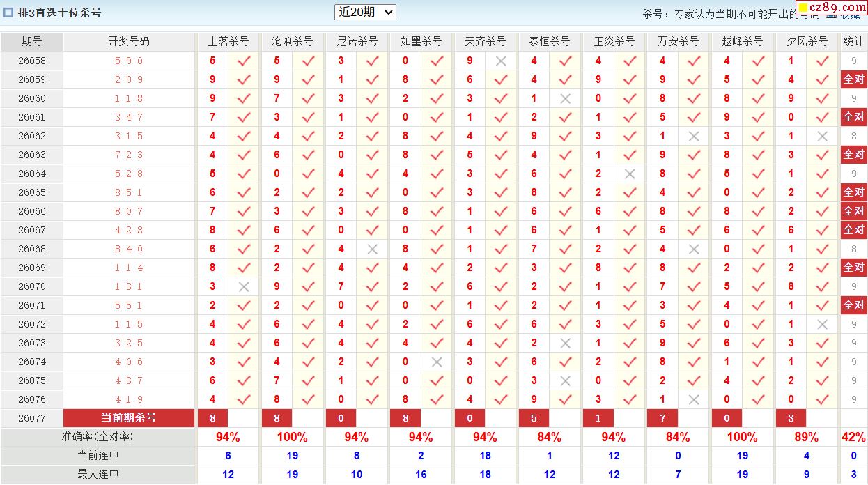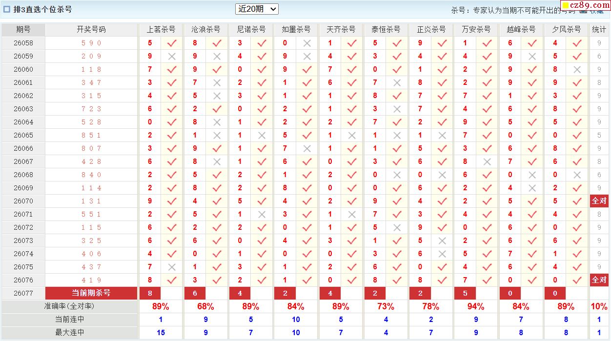 26年077期彩宝贝专家体彩P3杀号定码图表