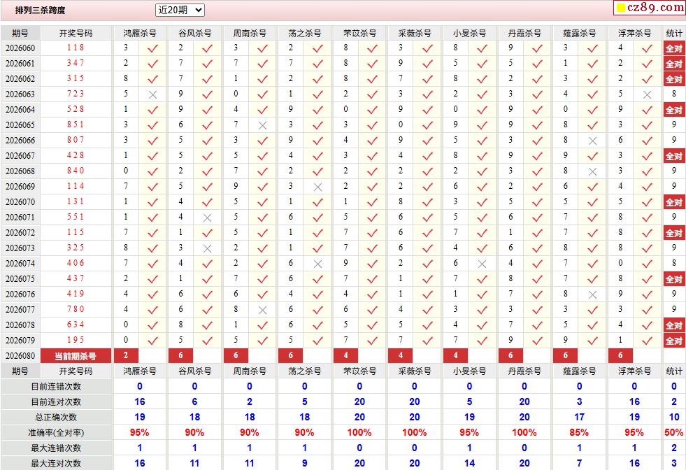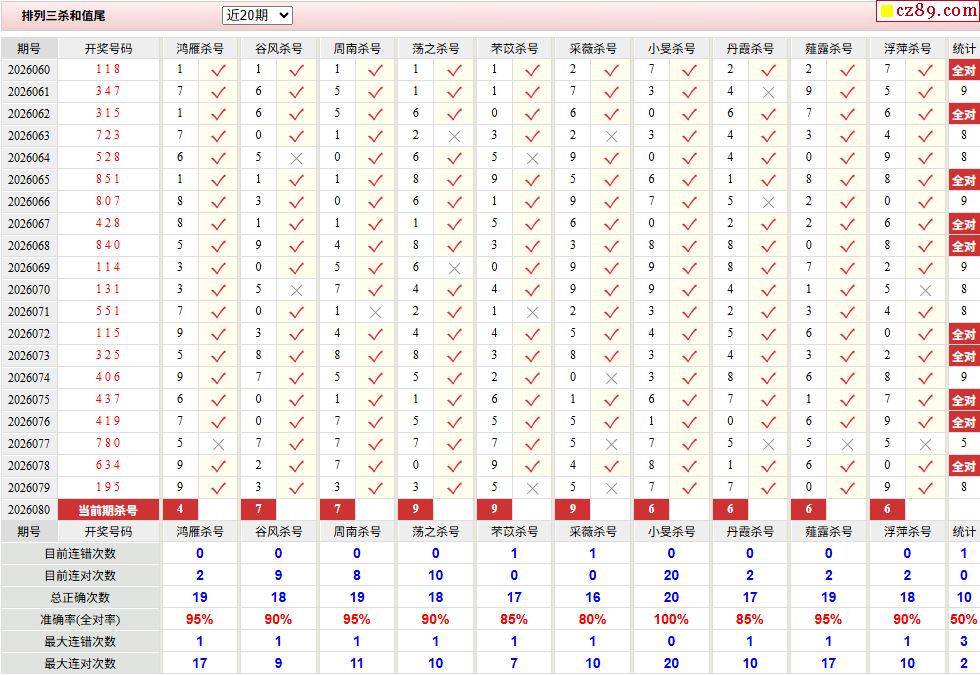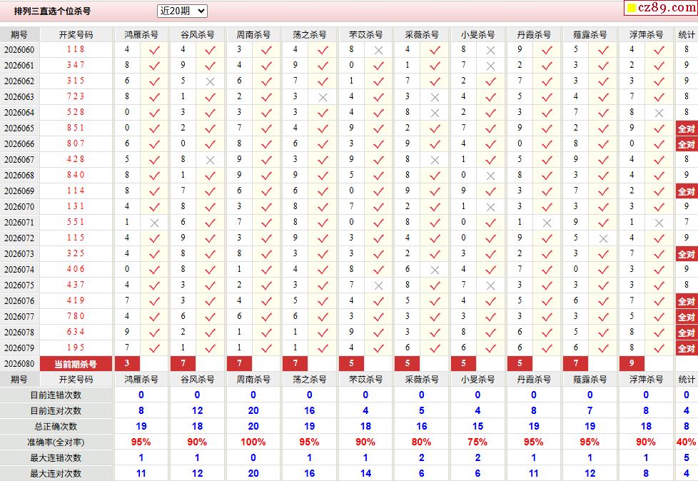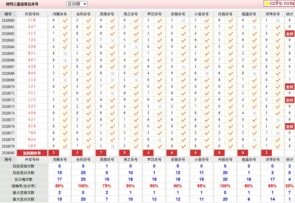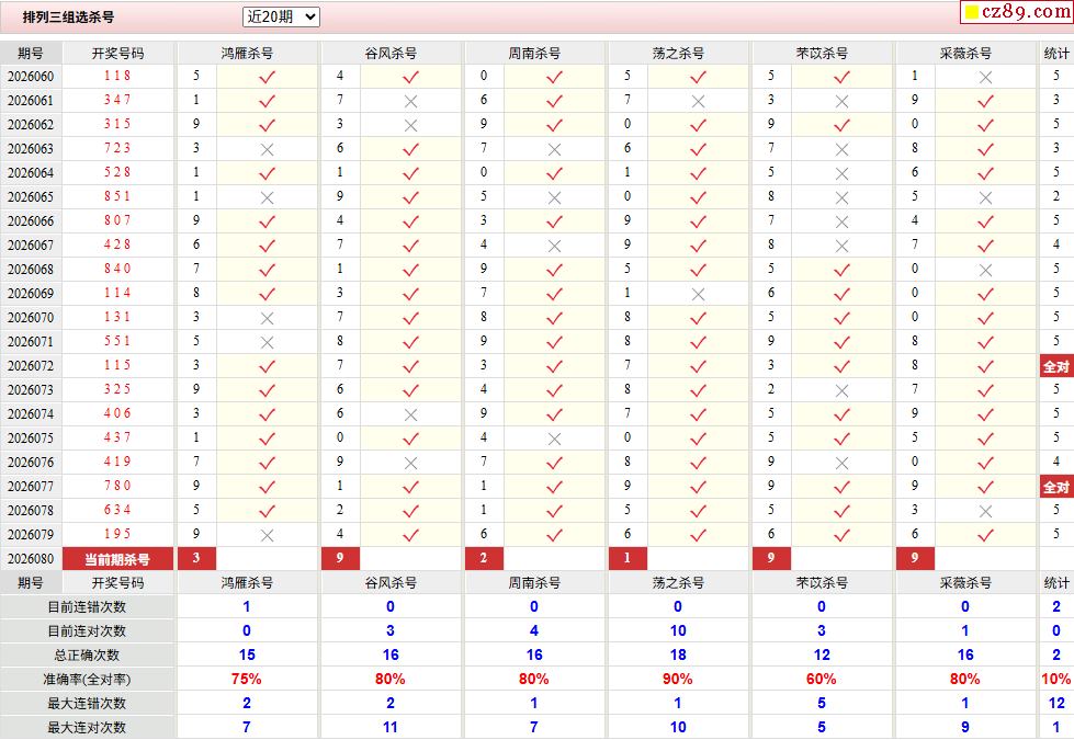 26年080期彩宝贝专家体彩P3杀号定码图表