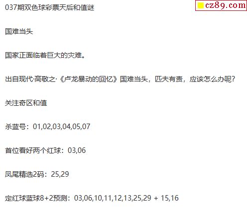 26年福彩双色球037期 彩票天后和值谜