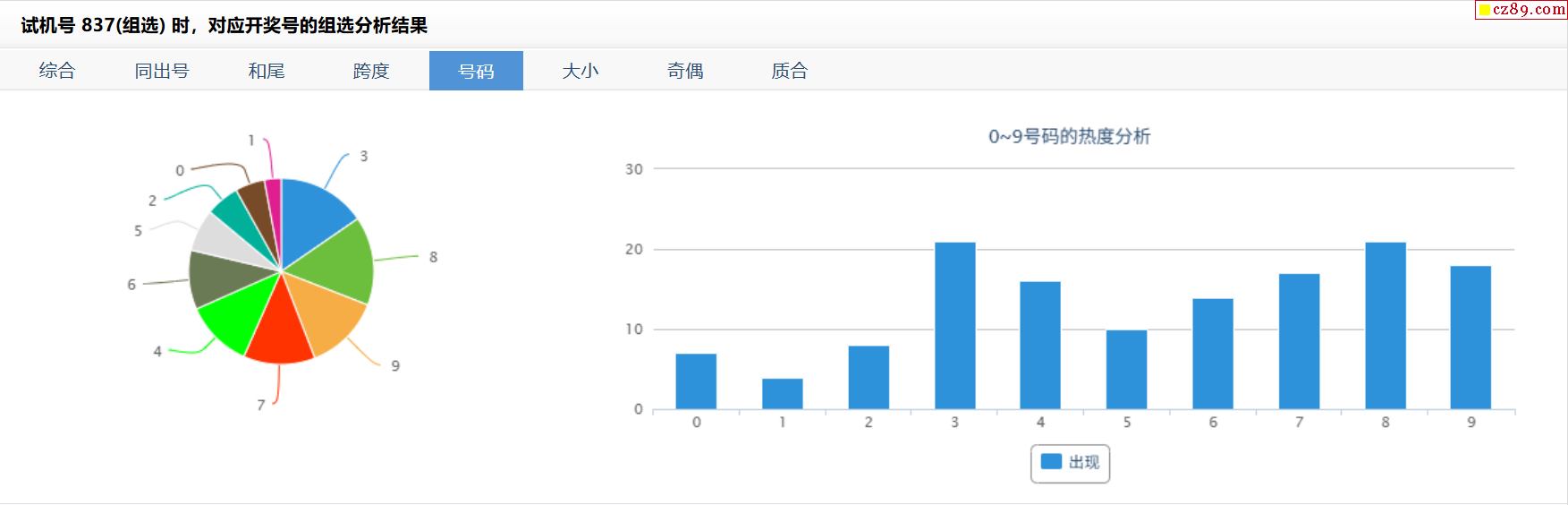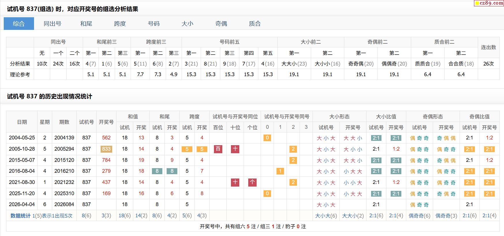 084期福彩3D试机号837对应开奖号的组选分析结果