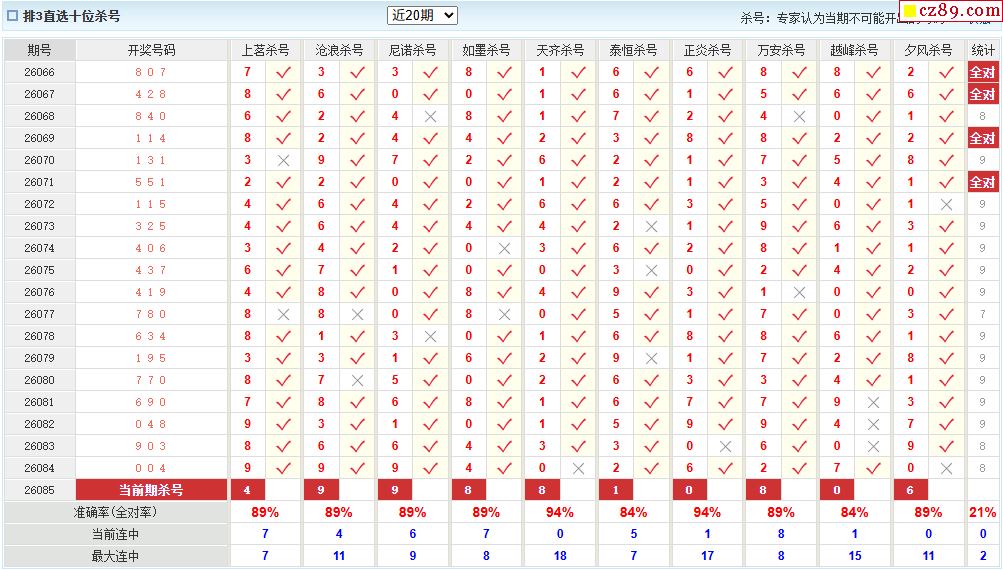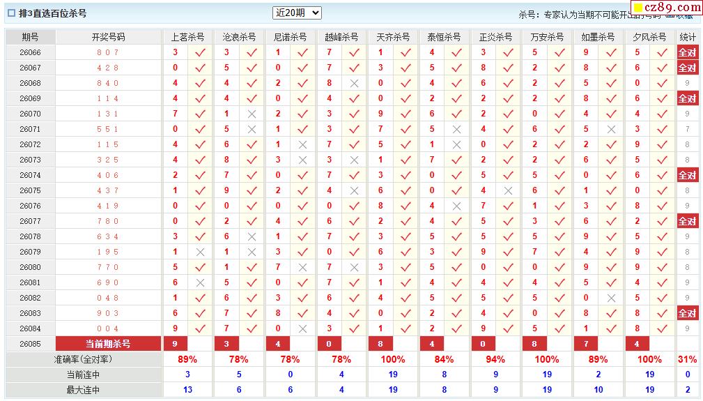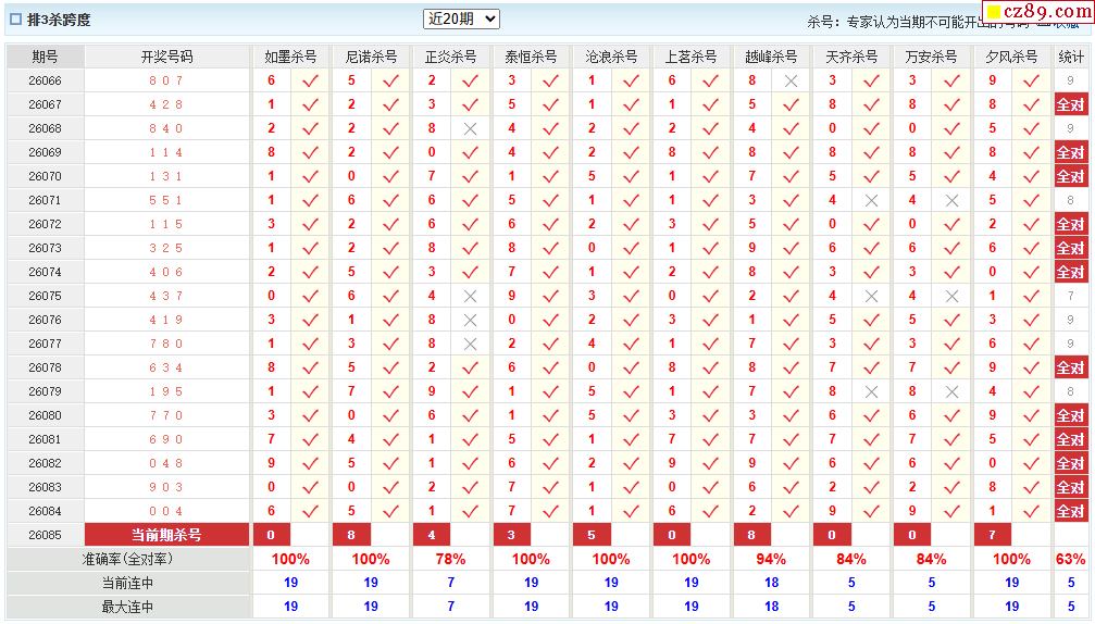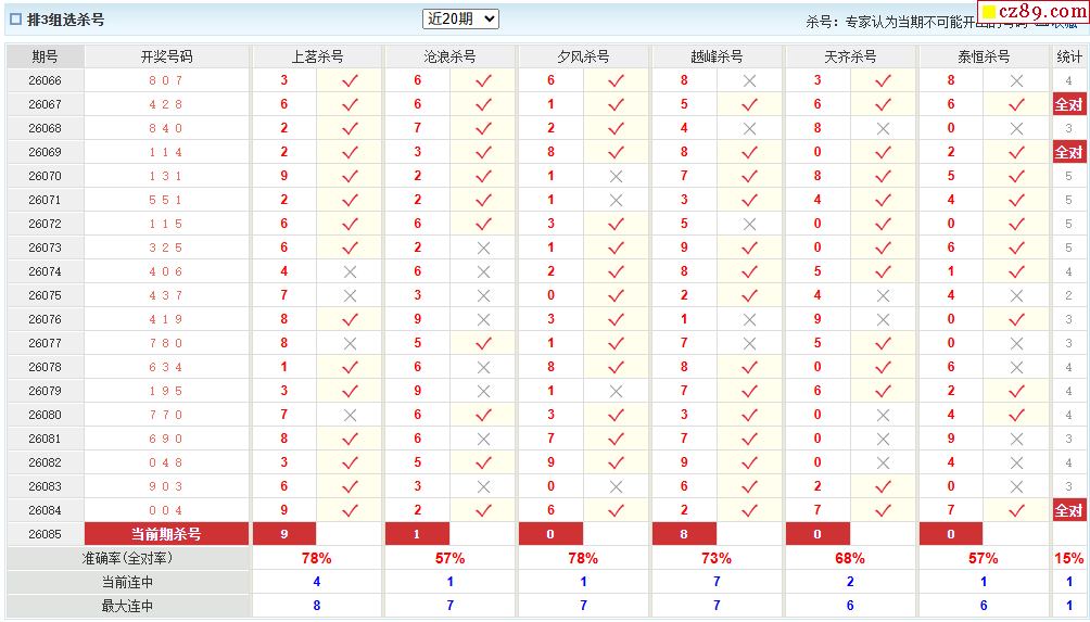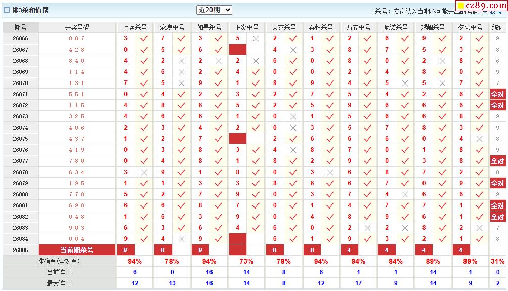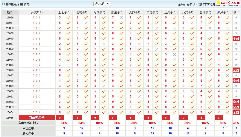 26年085期彩宝贝专家体彩P3杀号定码图表