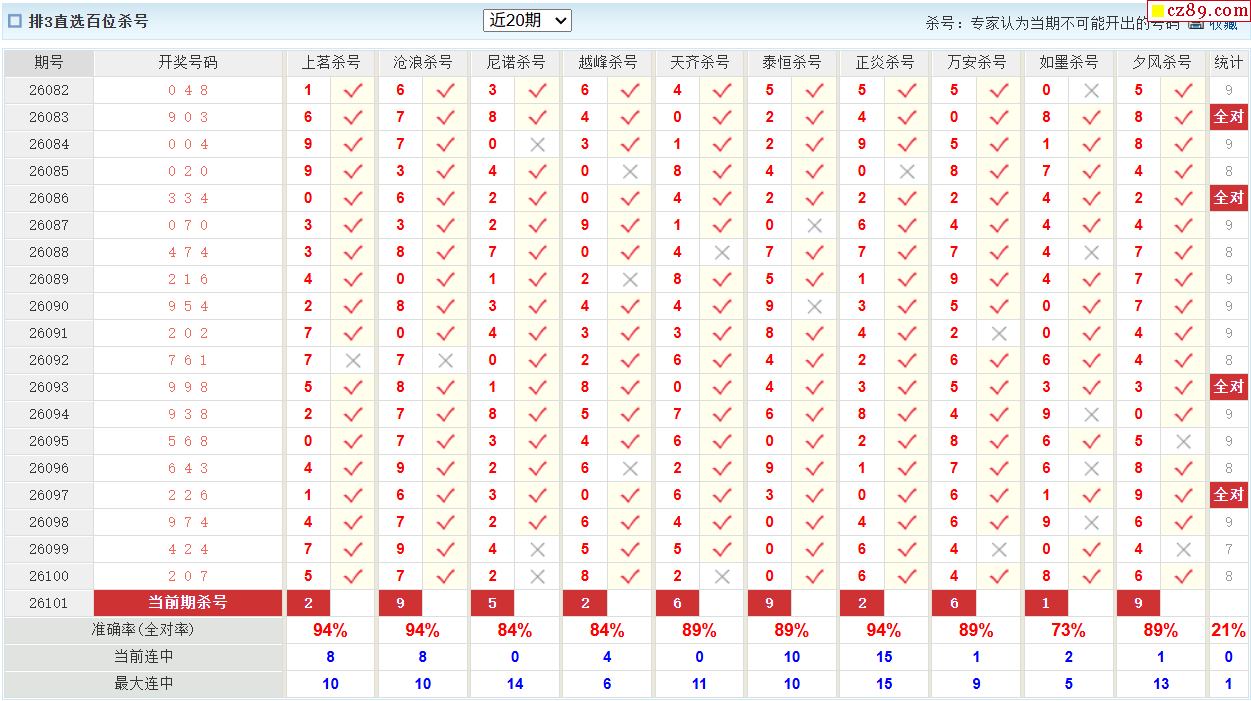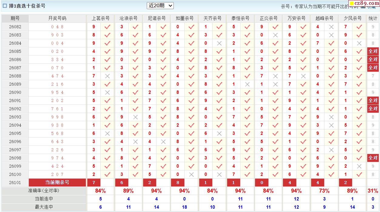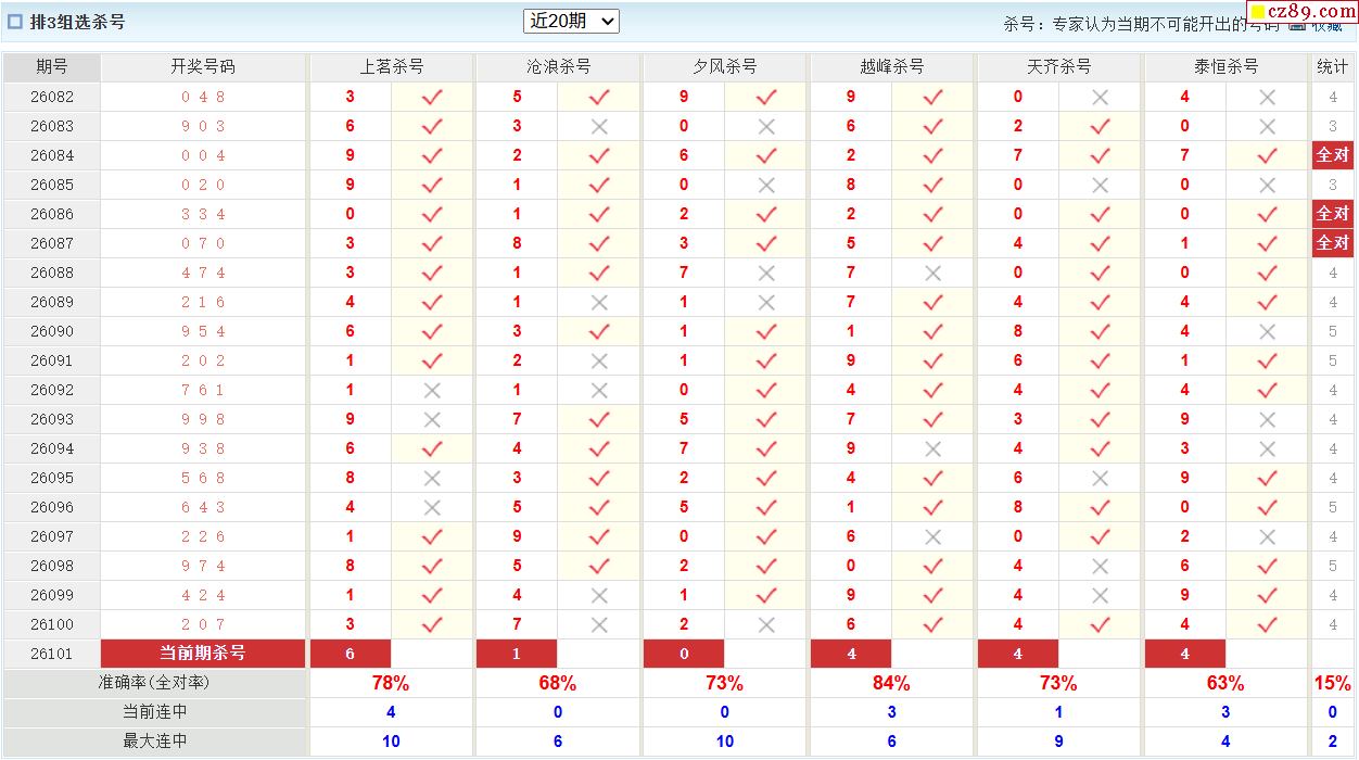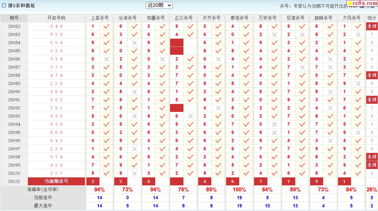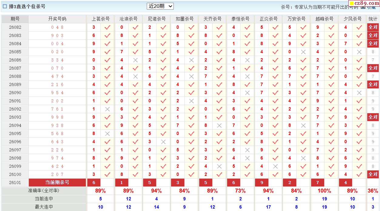 26年101期彩宝贝专家体彩P3杀号定码图表