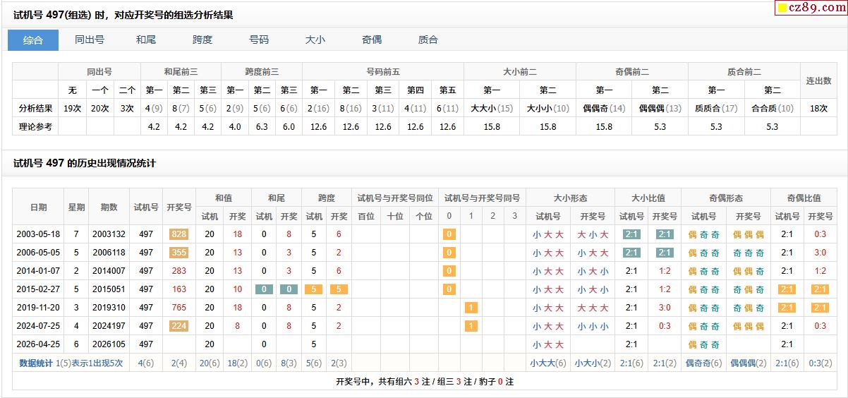 105期福彩3D试机号497对应开奖号的组选分析结果