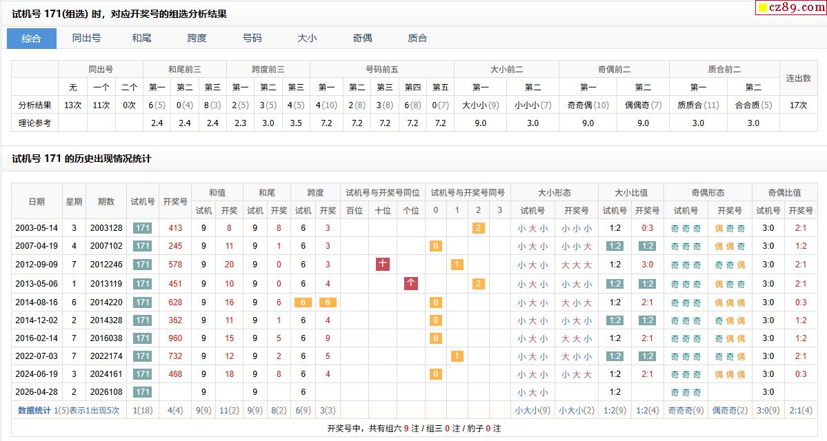 108期福彩3D试机号171对应开奖号的组选分析结果