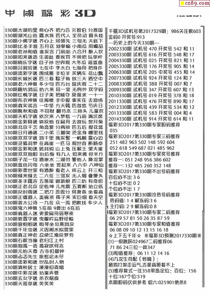牛彩版3D字谜彩报图25年330期打印版