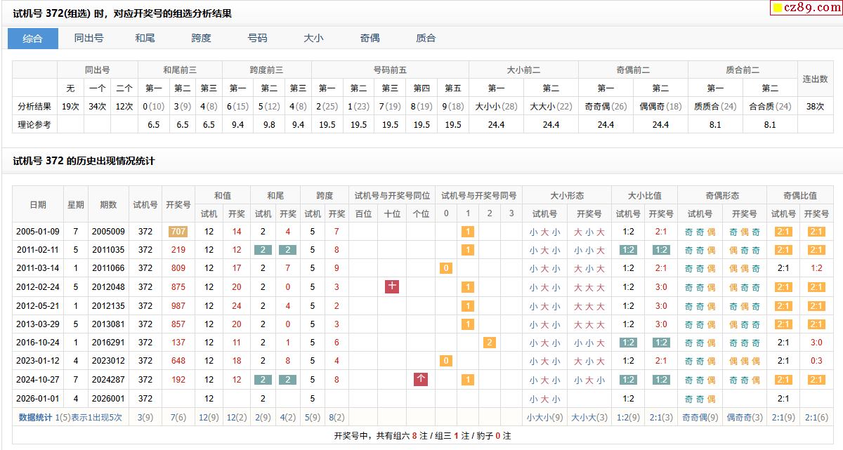 001期福彩3D试机号372对应开奖号的组选分析结果
