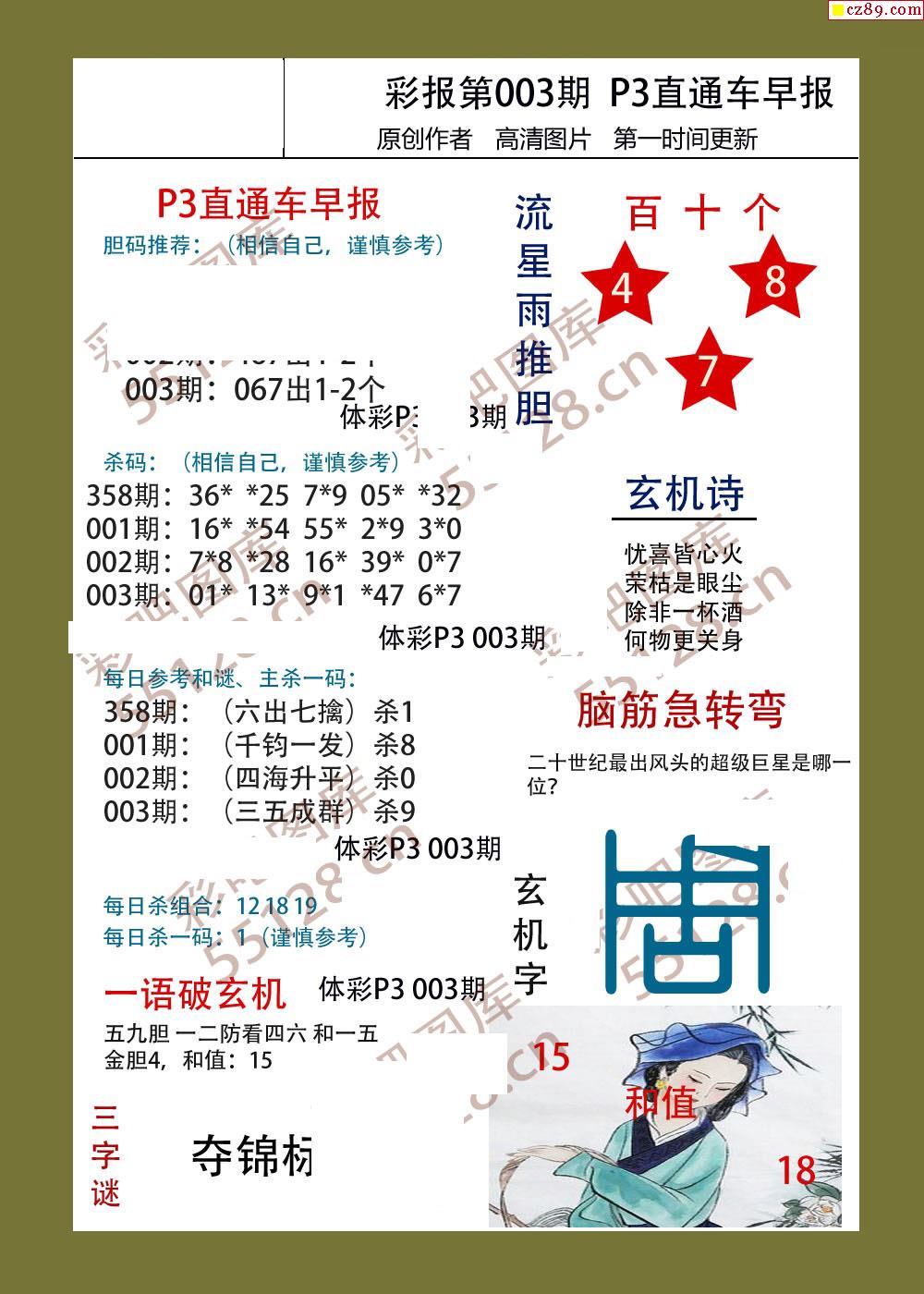 直通车早版003期体彩p3图谜