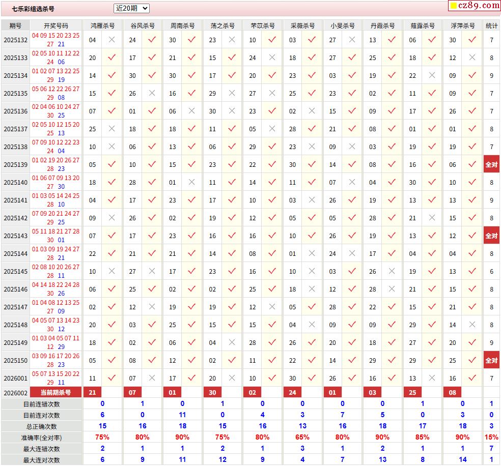 26年002期彩票专家福彩七乐彩杀号图表