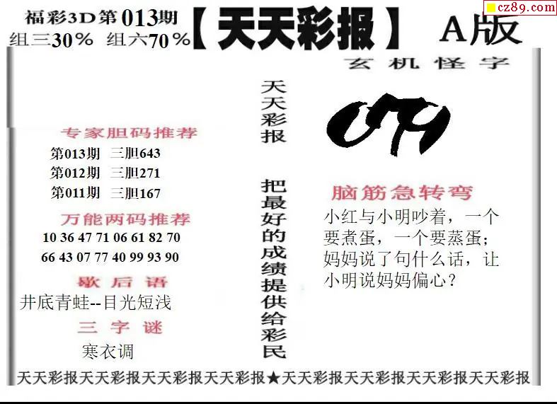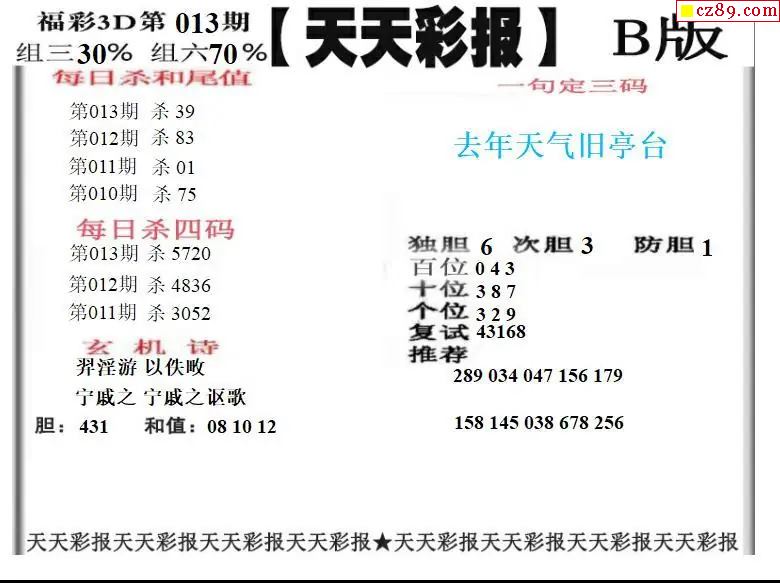 福彩3D2026013期天天彩报A版 天天彩报B版