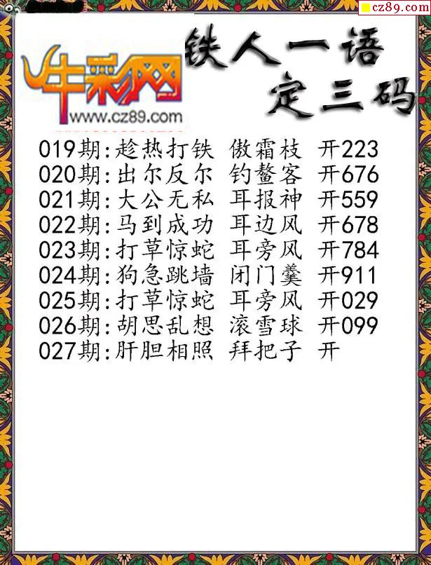 福彩3D2026027期福彩金刚一句定三码字图谜