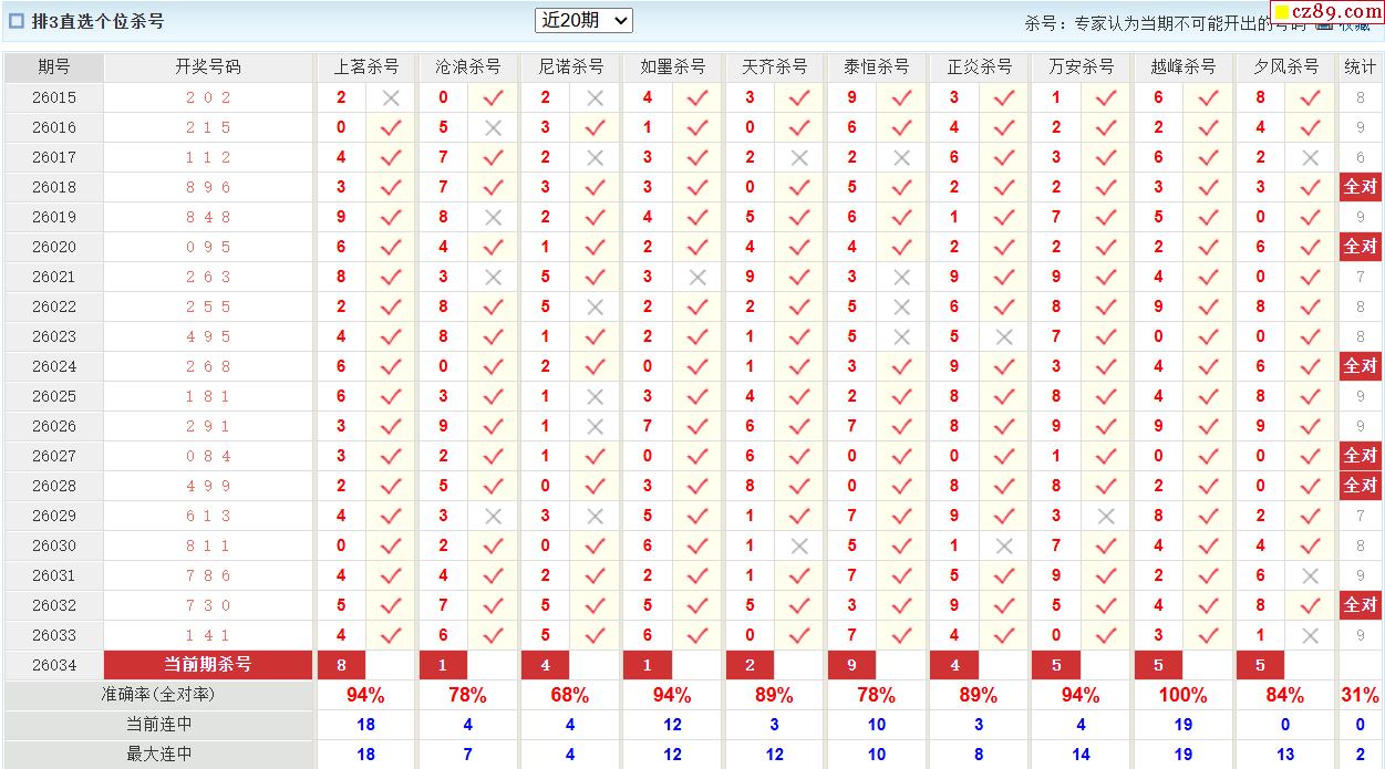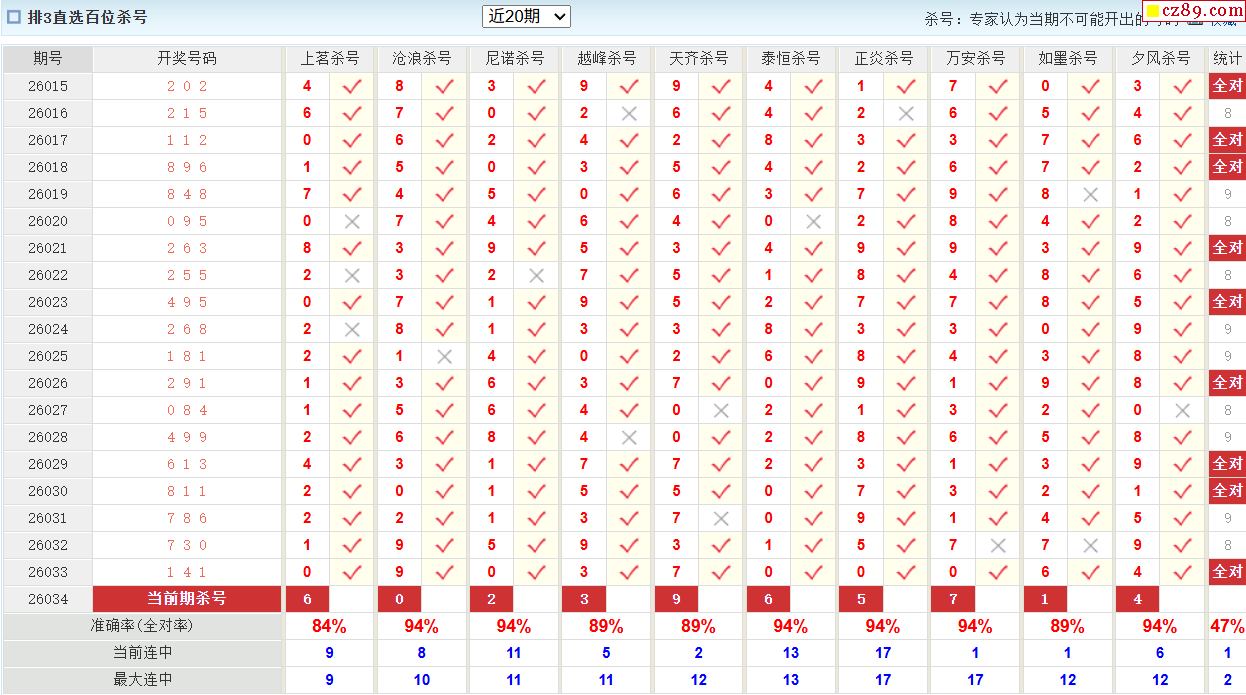 26年034期彩宝贝专家体彩P3杀号定码图表