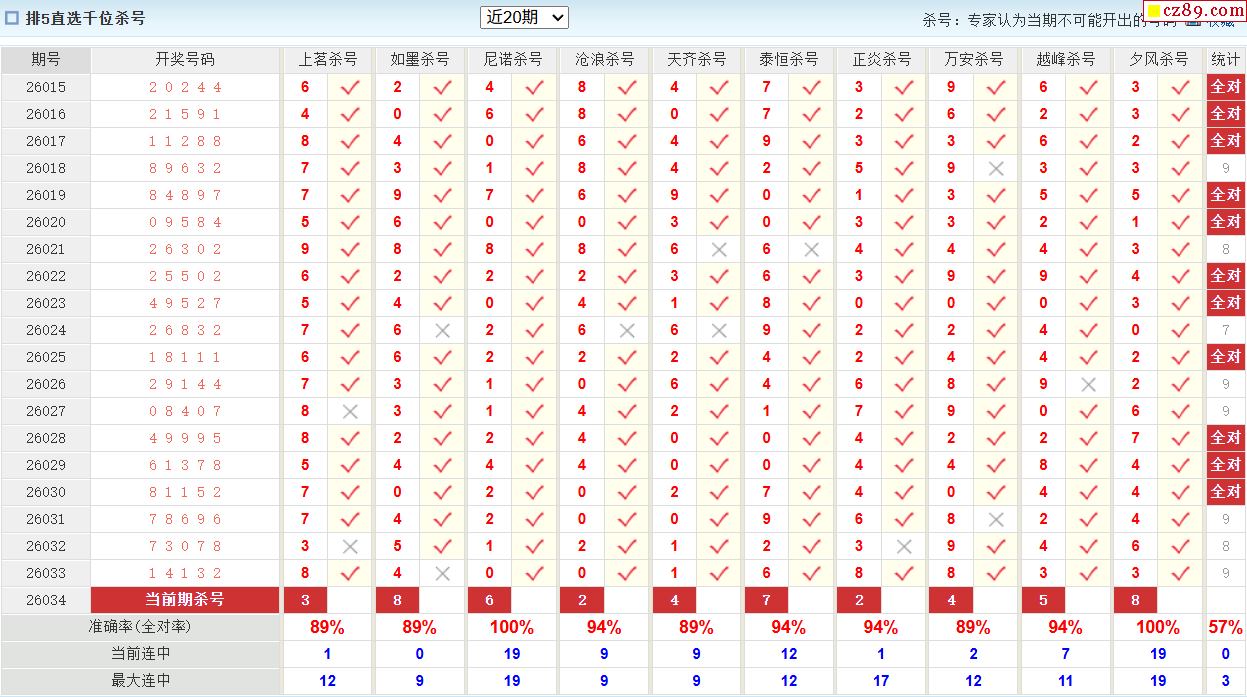 26年034期彩宝贝专家体彩P3杀号定码图表