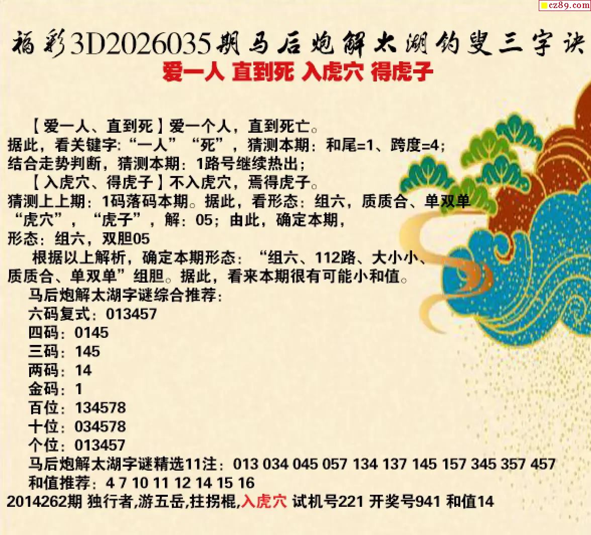 马后炮解26年035期3d太湖钓叟之 得虎子