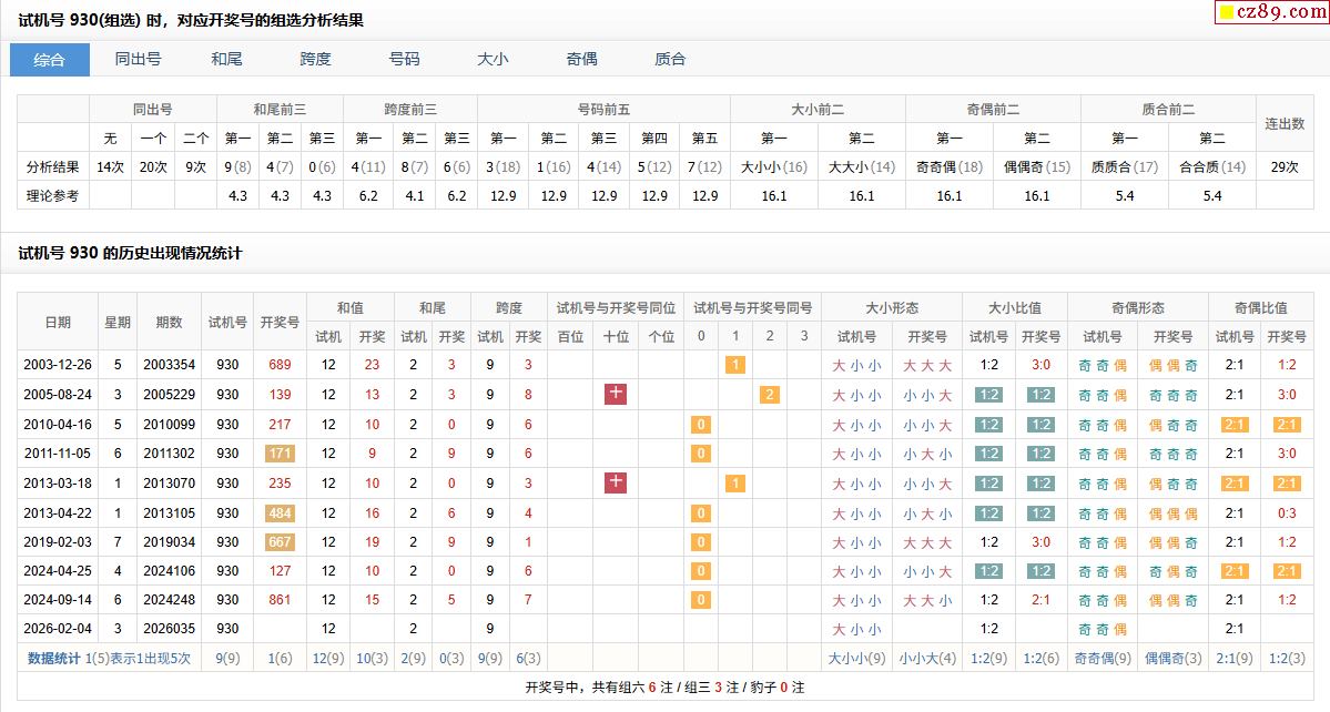 035期福彩3D试机号930对应开奖号的组选分析结果