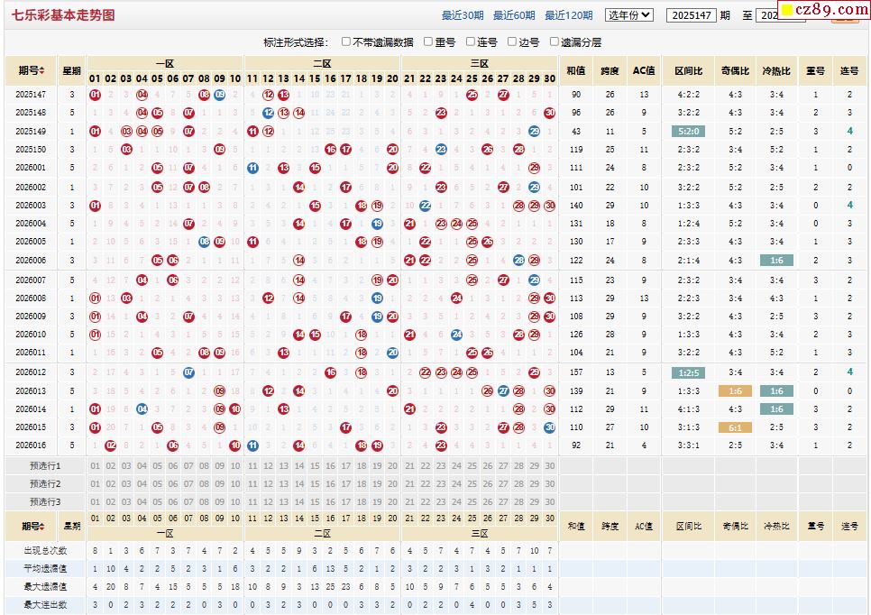 2026年017期福彩七乐彩近期走势图分析