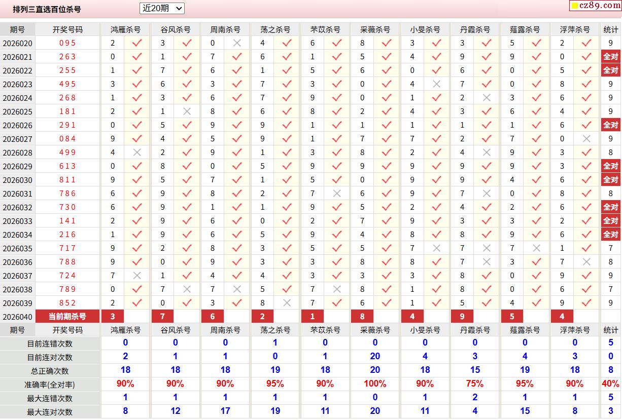 26年040期彩宝贝专家体彩P3杀号定码图表