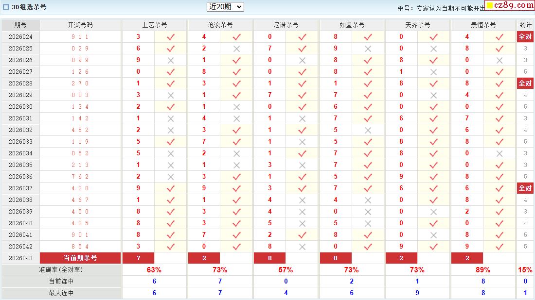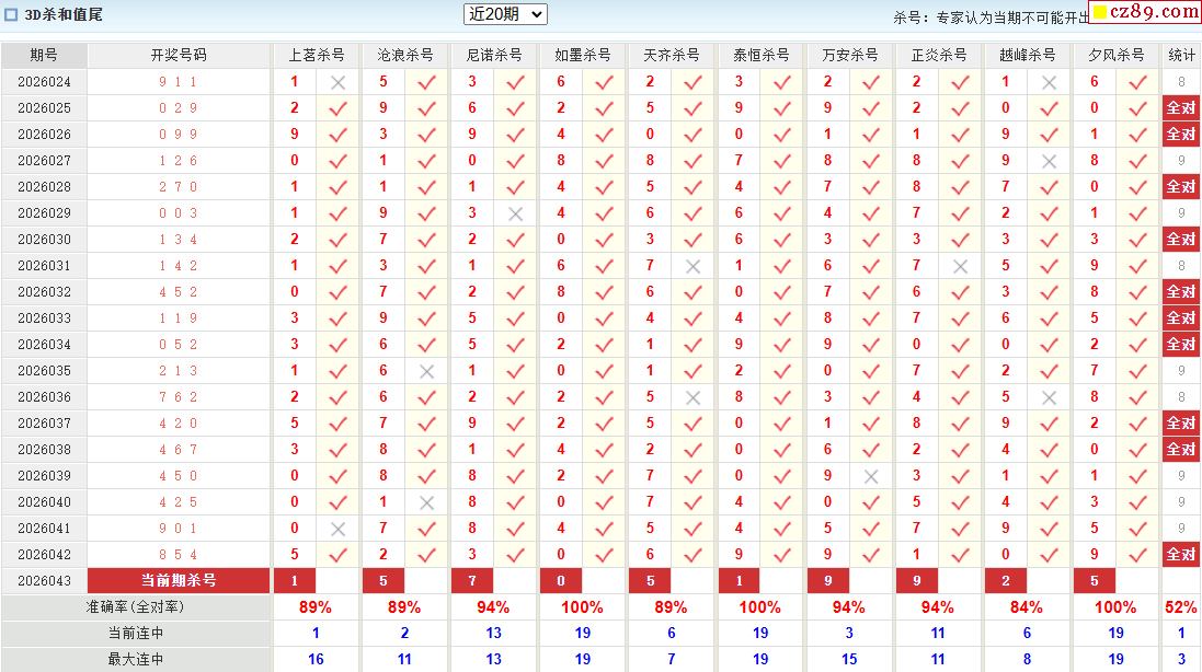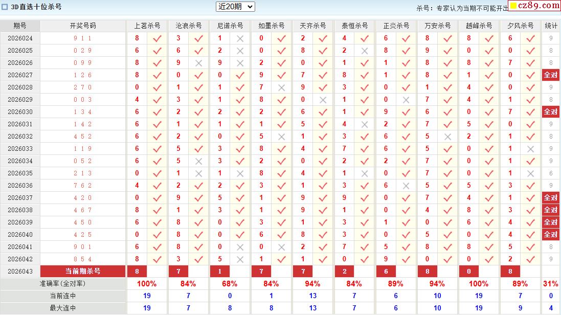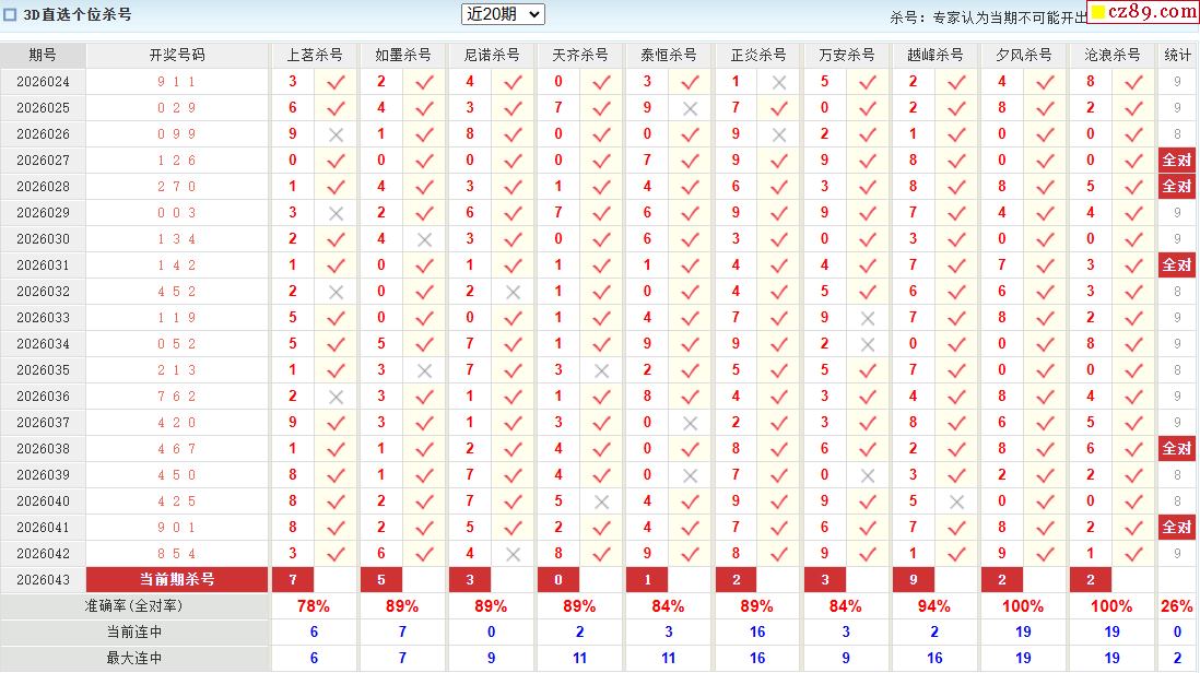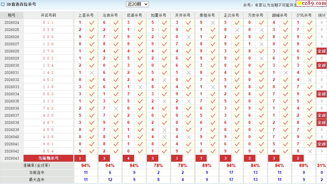 26年043期彩宝贝专家福彩3D杀号定码图表