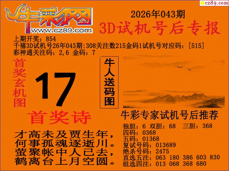 福彩3D26年043期 牛彩网3d试机号后专家分析