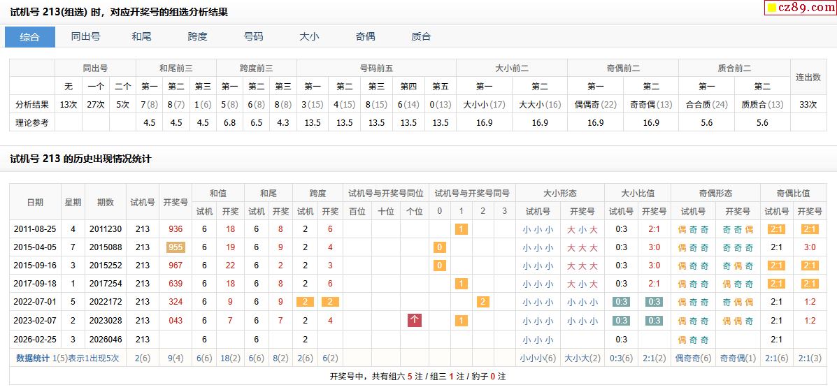 046期福彩3D试机号213对应开奖号的组选分析结果