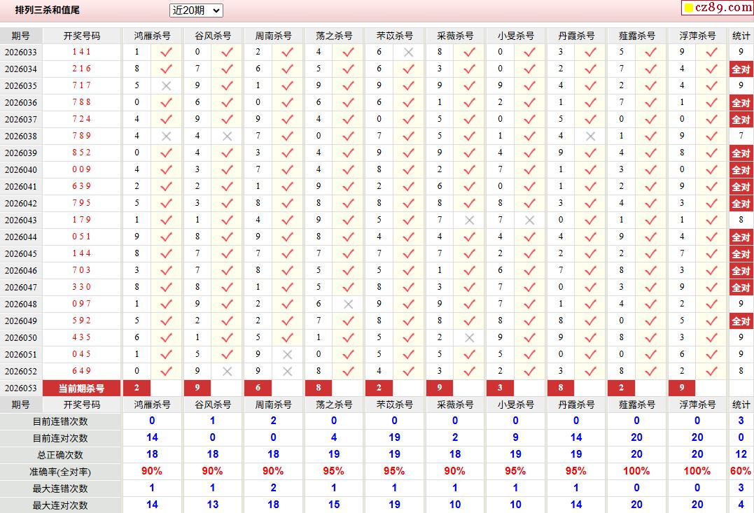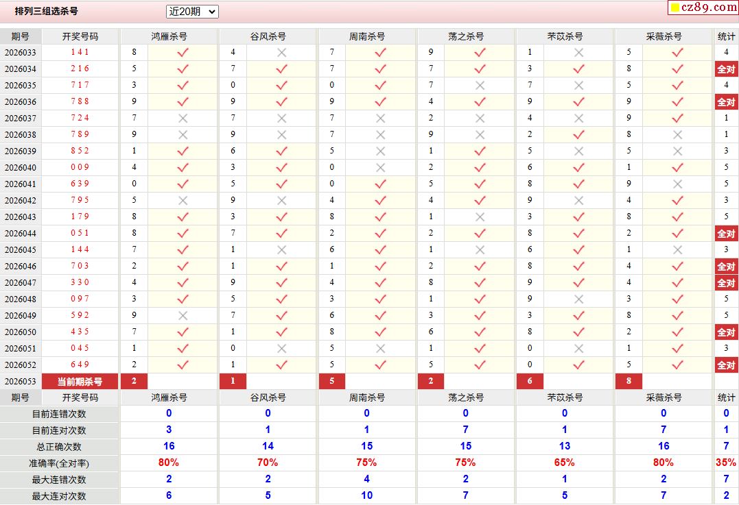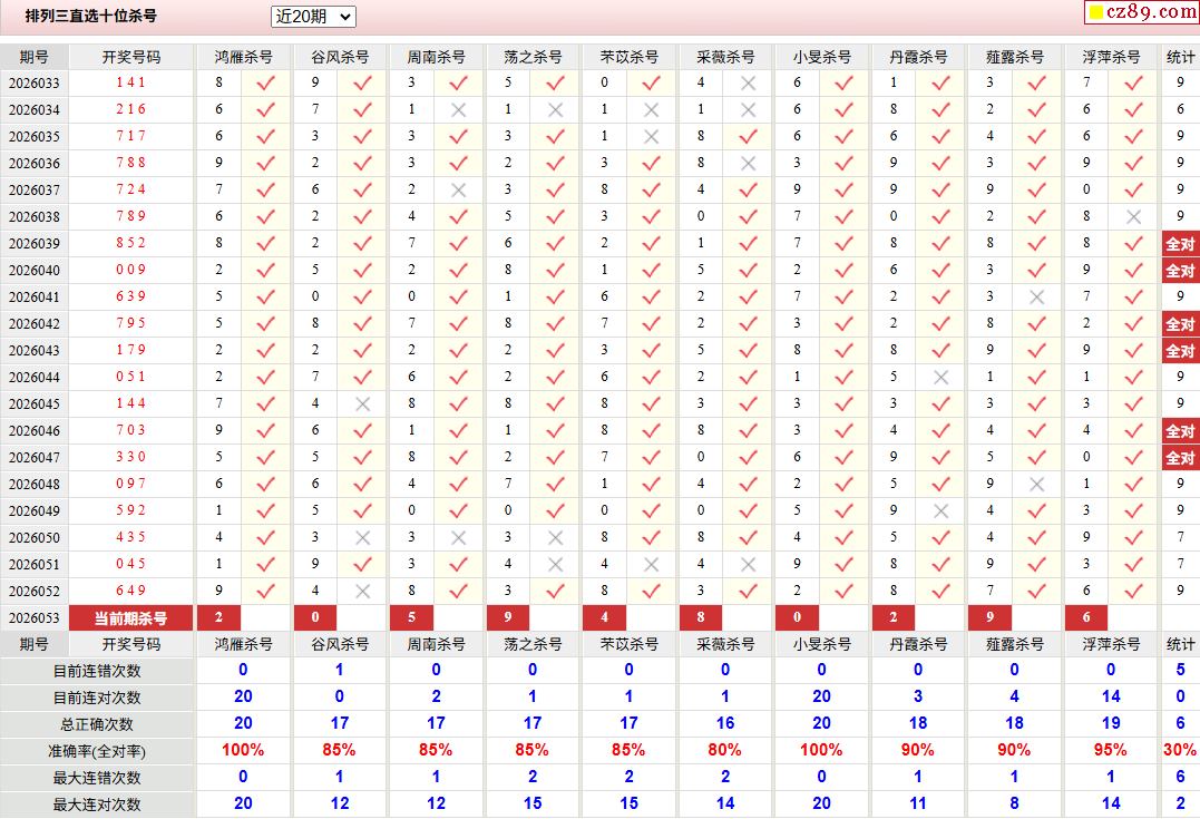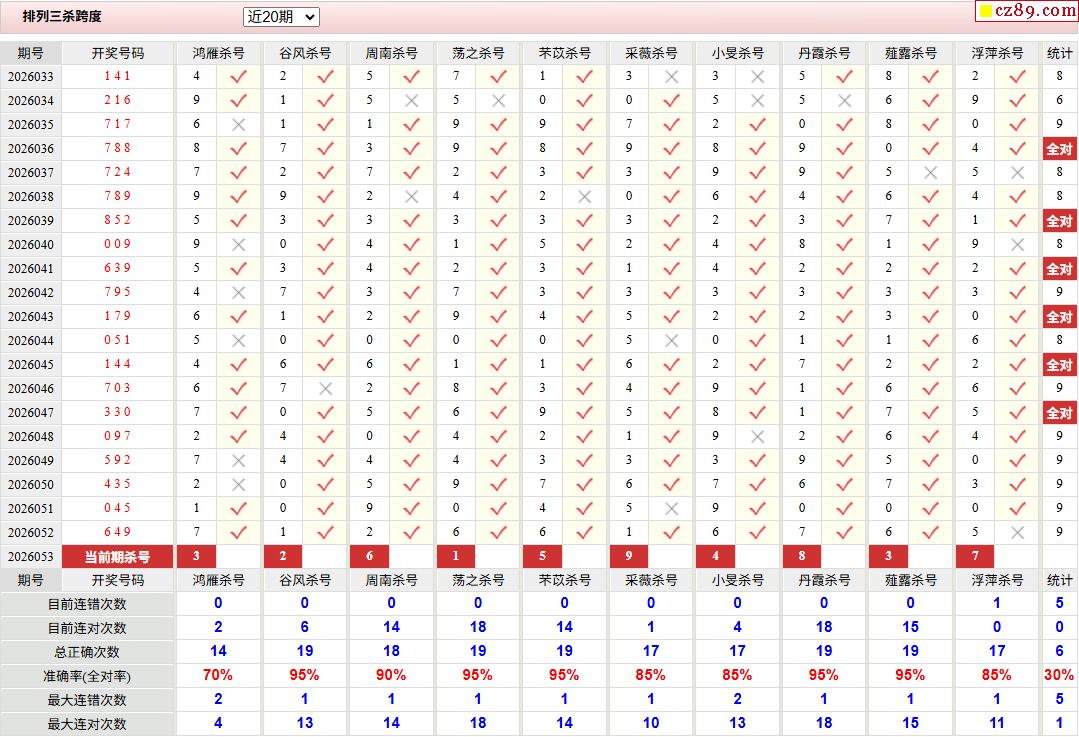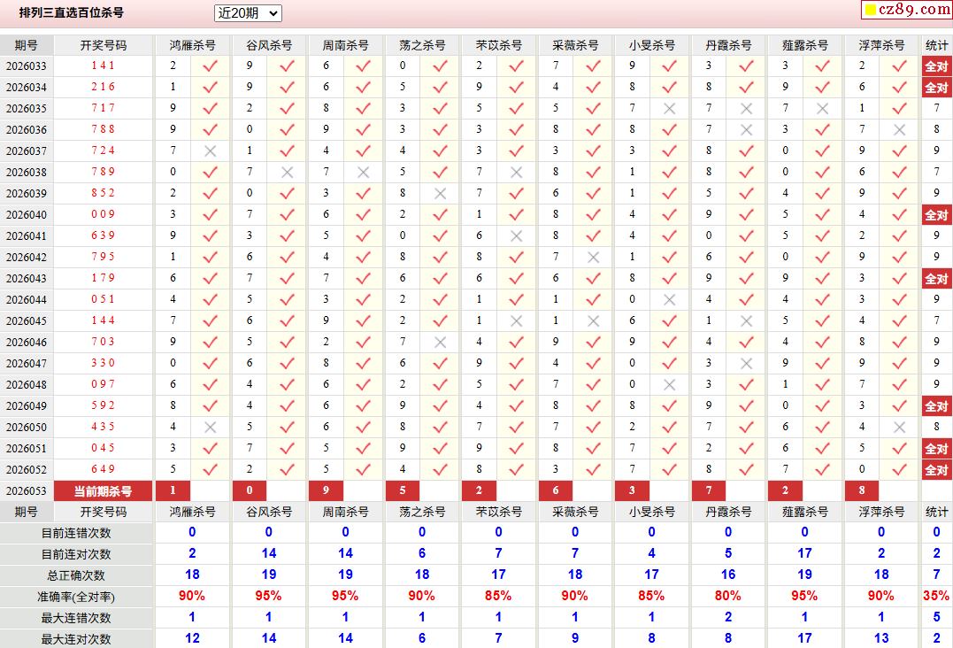 26年053期彩宝贝专家体彩P3杀号定码图表
