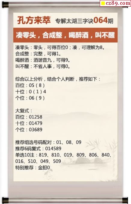 三丈火福彩3D26年064期猜数太湖字谜 凑零头