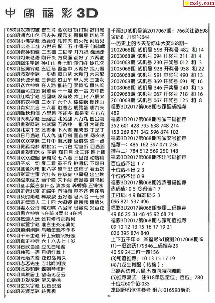 福彩3D2026068期牛彩图谜预测汇总