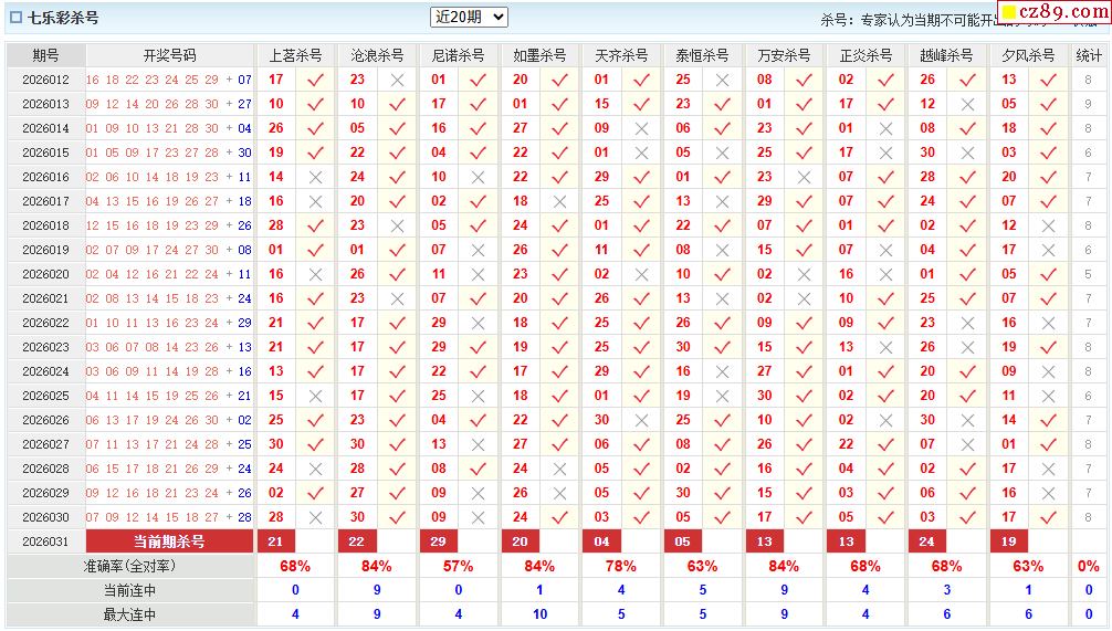 26年031期彩票专家福彩七乐彩杀号图表