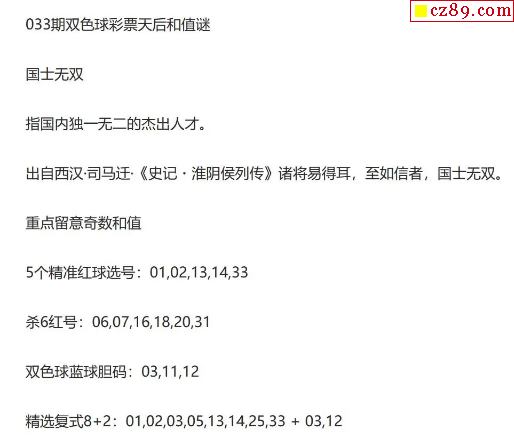 26年福彩双色球033期 彩票天后和值谜
