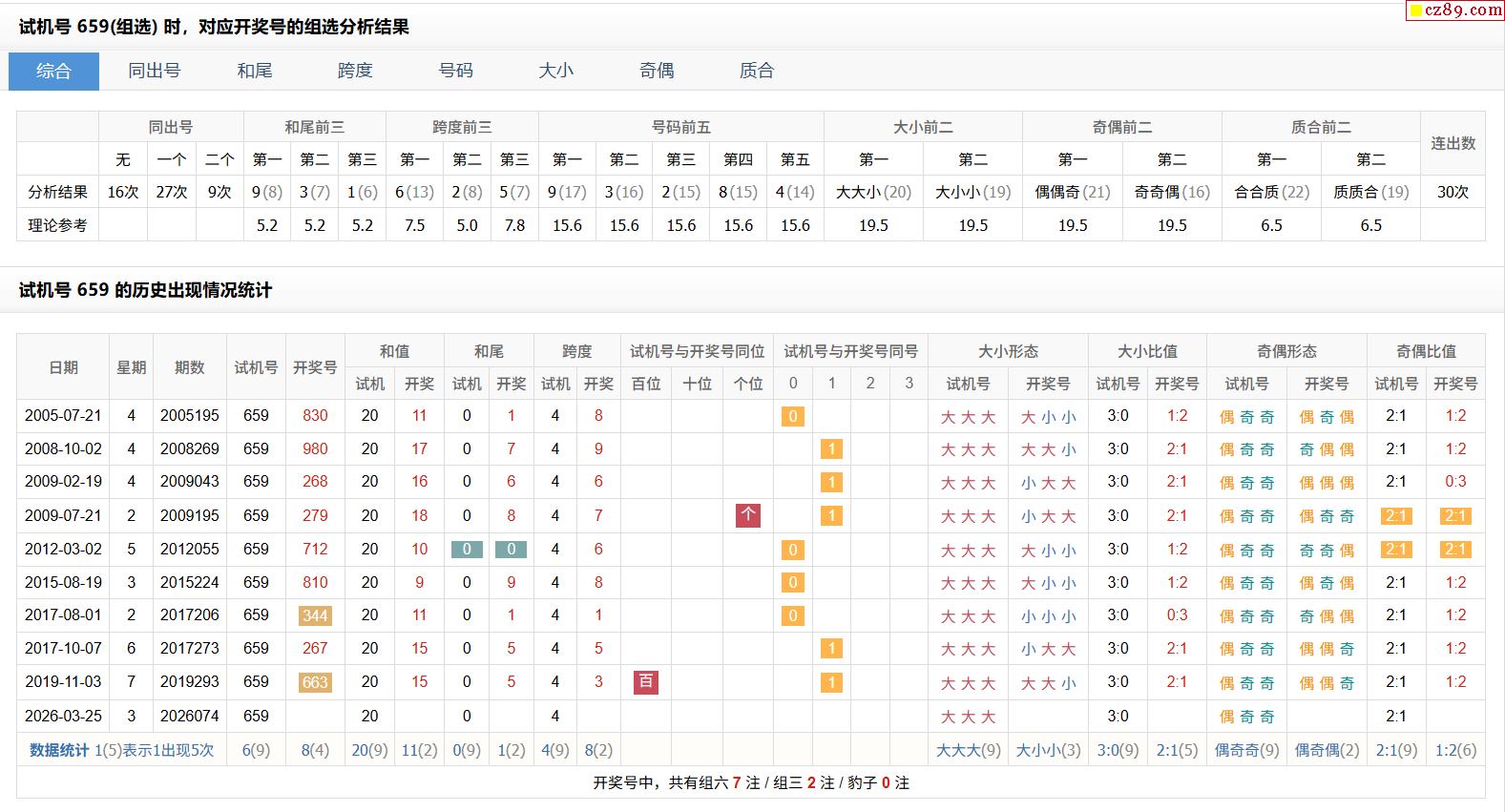 074期福彩3D试机号659对应开奖号的组选分析结果