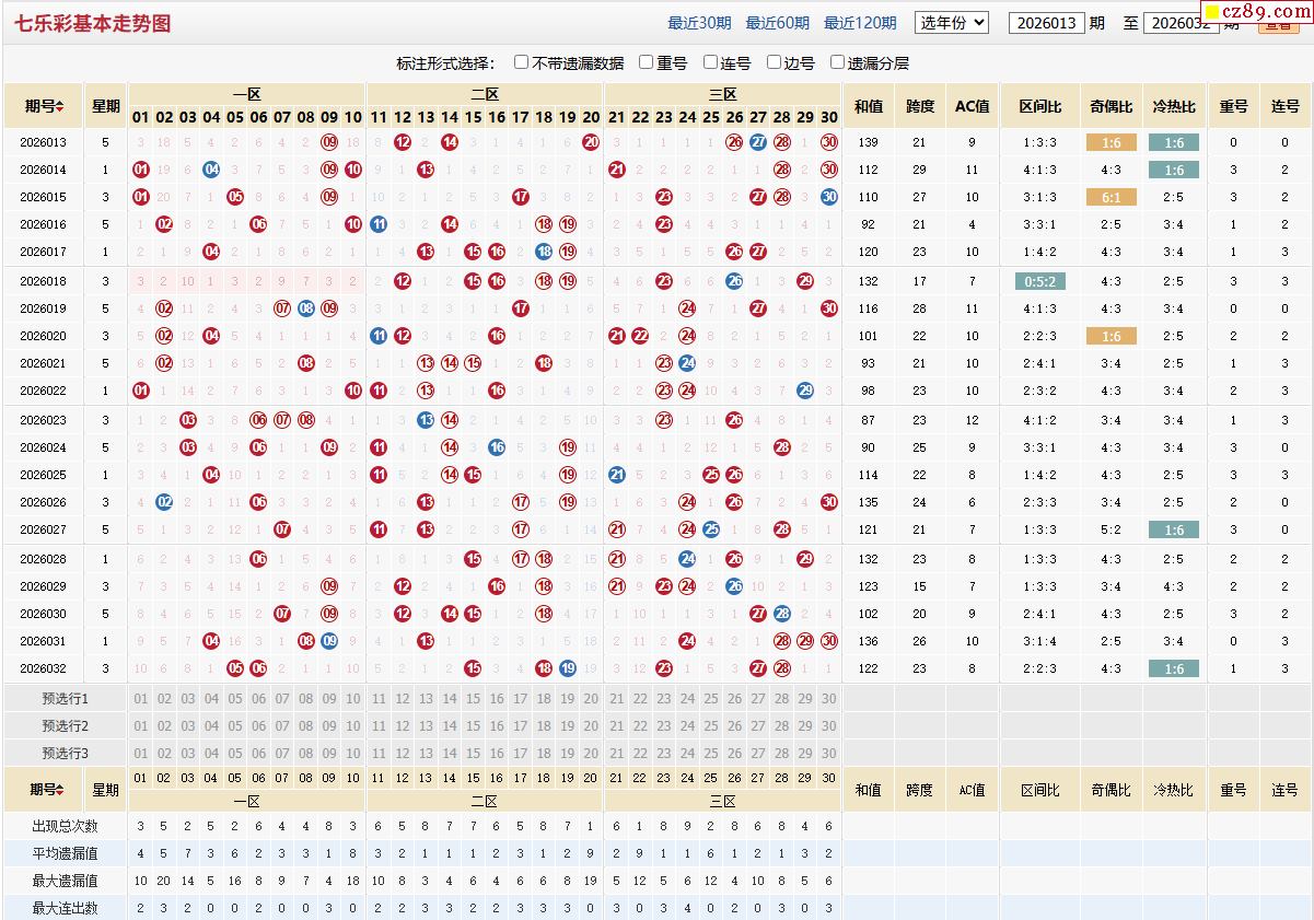 2026年033期福彩七乐彩近期走势图分析