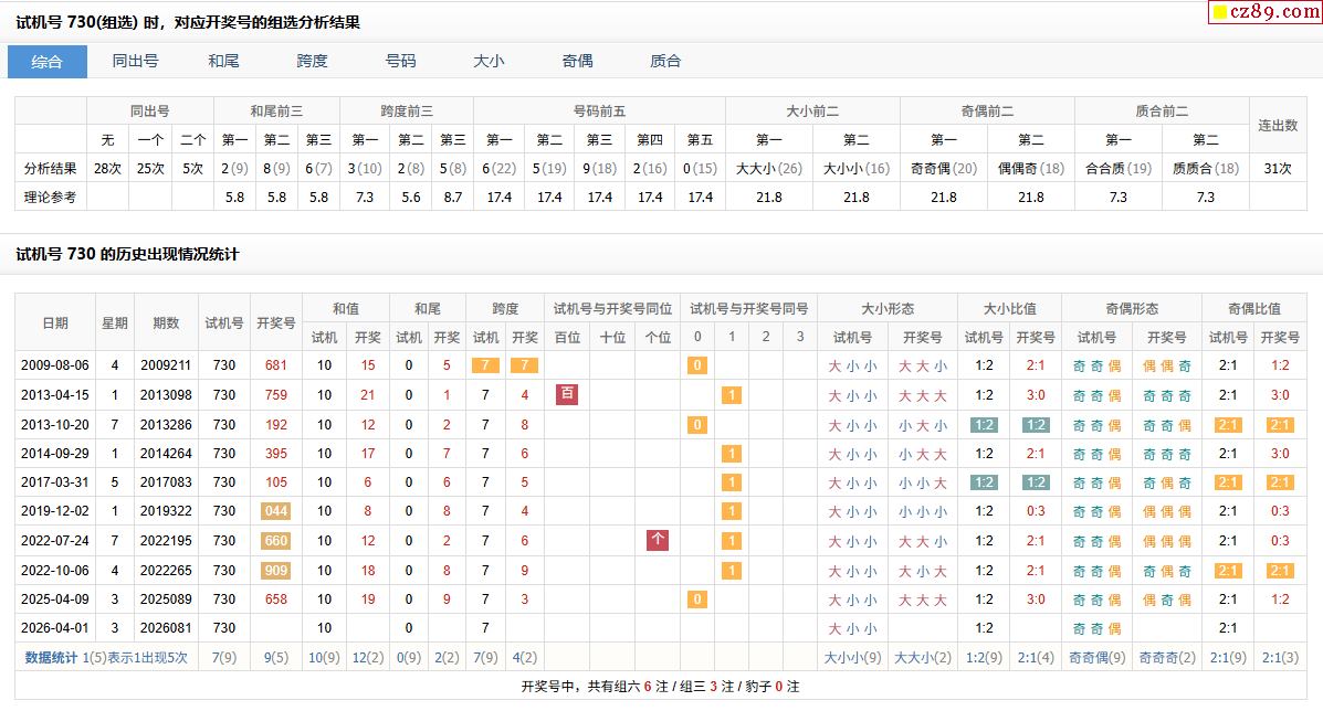 081期福彩3D试机号730对应开奖号的组选分析结果