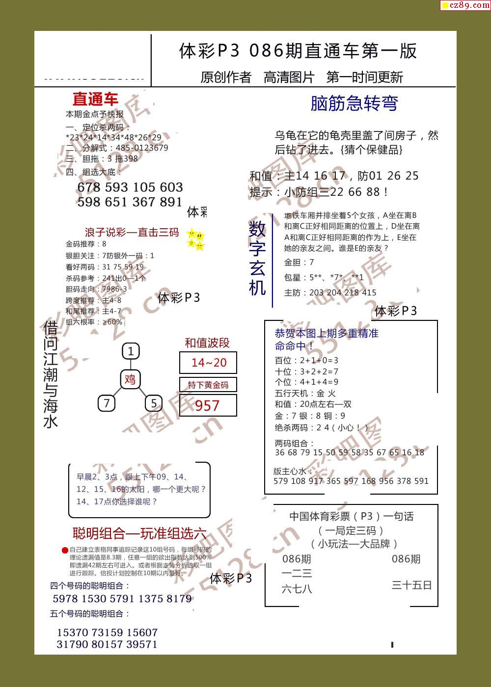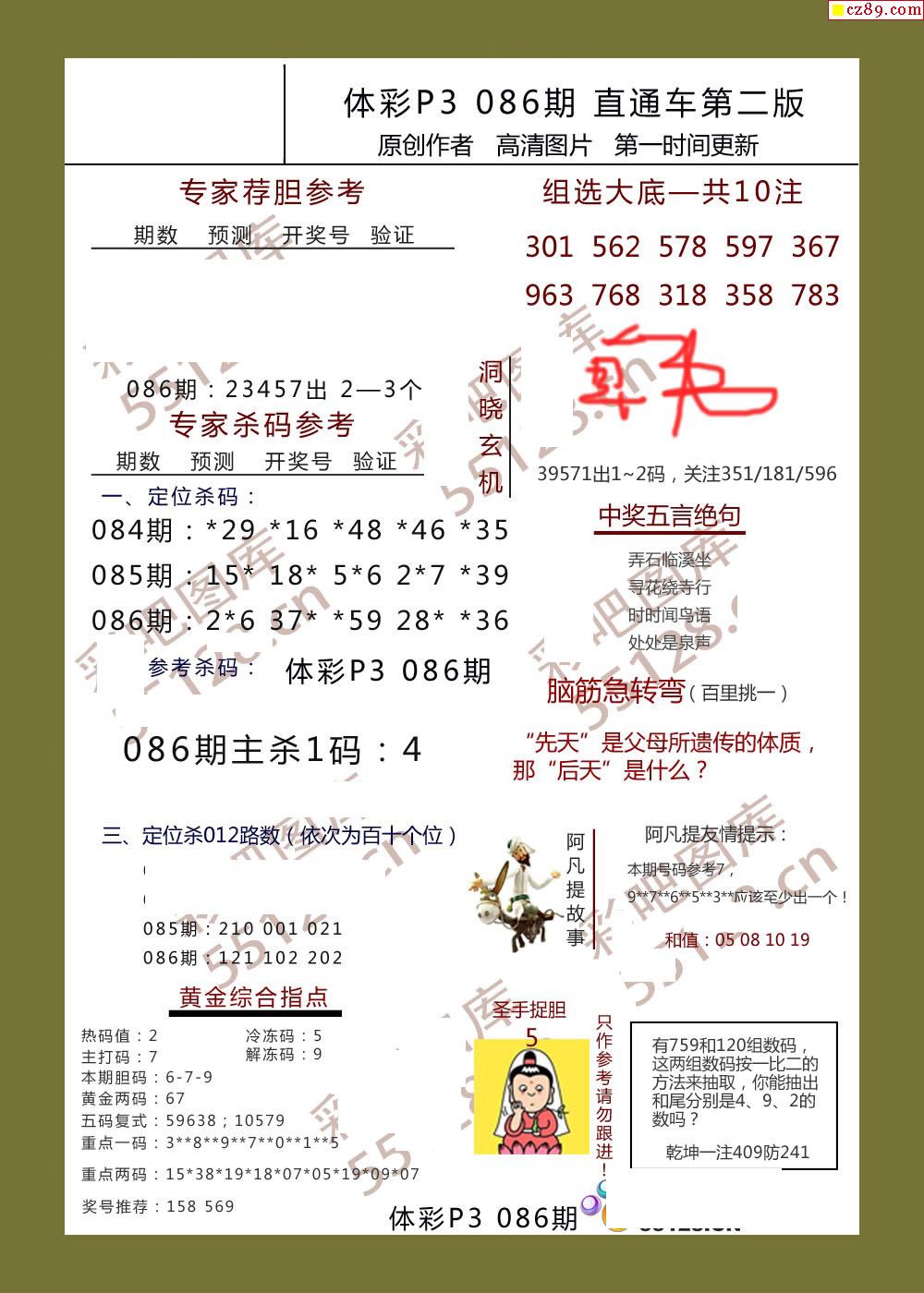 直通车AB版086期体彩p3图谜