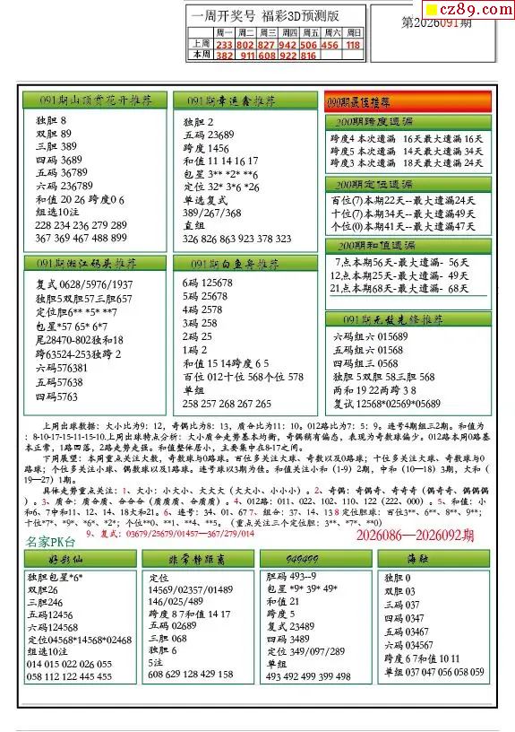 牛彩版3D预测彩报图26年091期打印版