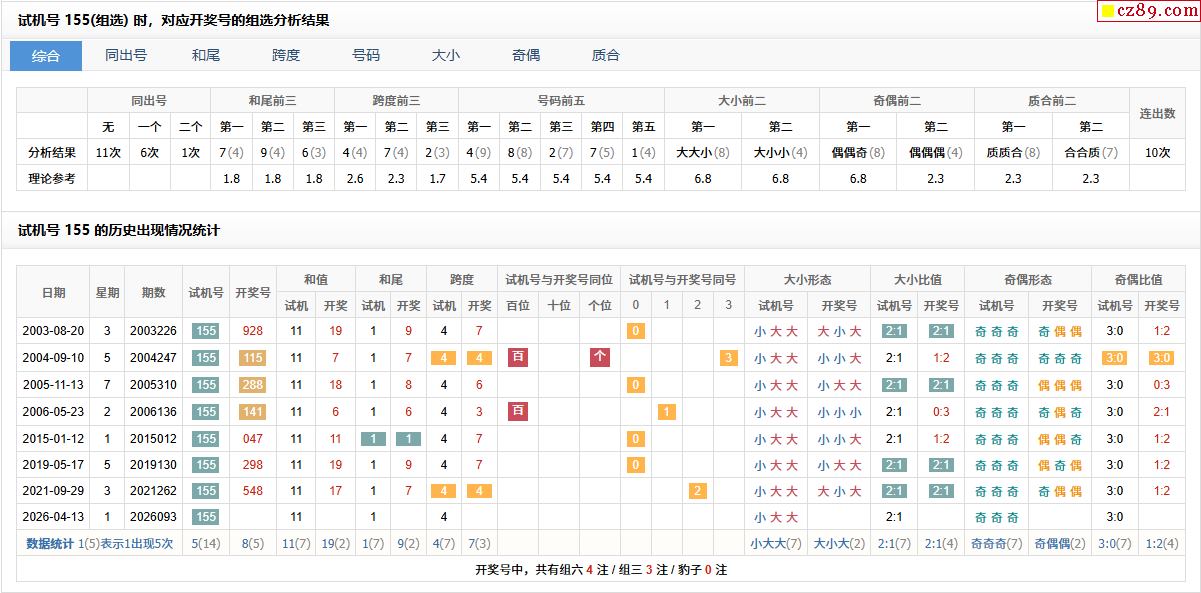 093期福彩3D试机号155对应开奖号的组选分析结果