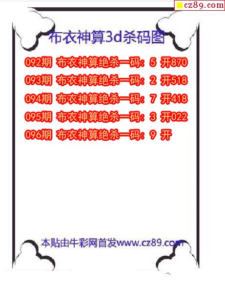 牛彩彩神杀码2026096期3d图谜(原创)