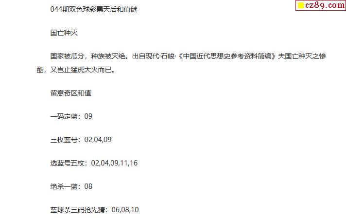 26年福彩双色球044期 彩票天后和值谜