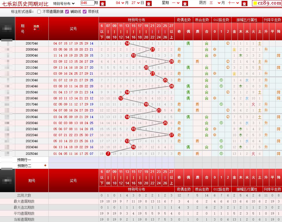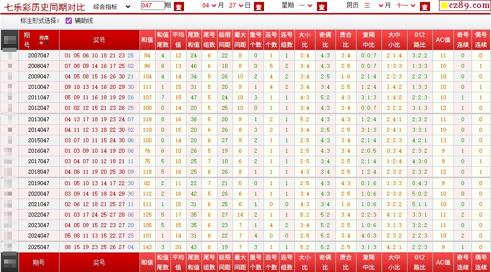 047期七乐彩历史同期对比图