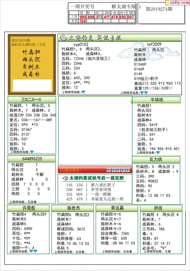 2019274期解太湖3d字图迷汇总报
