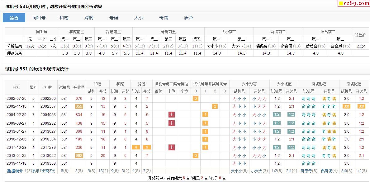 308期福彩3D试机号531对应开奖号的组选分析结果