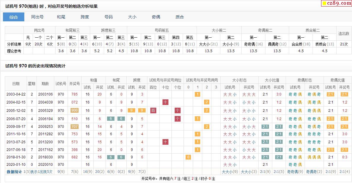 010期福彩3D试机号970对应开奖号的组选分析结果