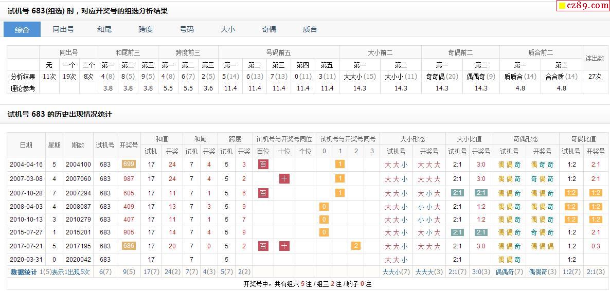 042期福彩3D试机号683对应开奖号的组选分析结果