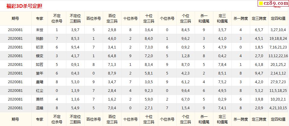 20年081期彩宝贝专家福彩3D杀号定码图表
