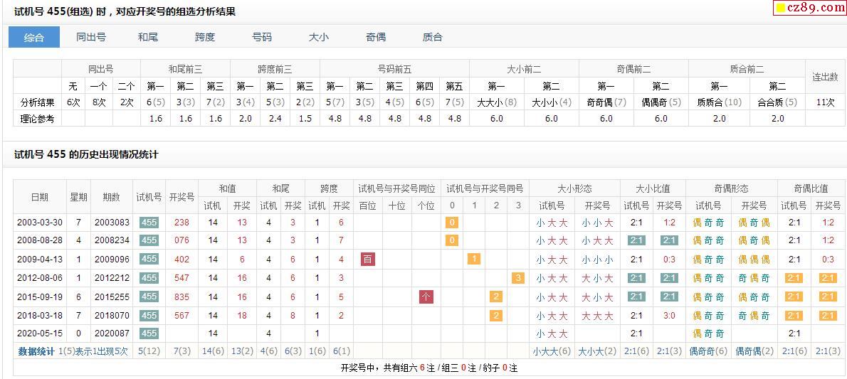 087期福彩3D试机号455对应开奖号的组选分析结果