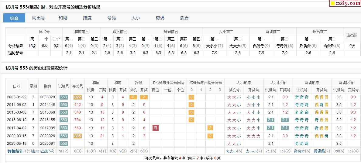091期福彩3D试机号553对应开奖号的组选分析结果