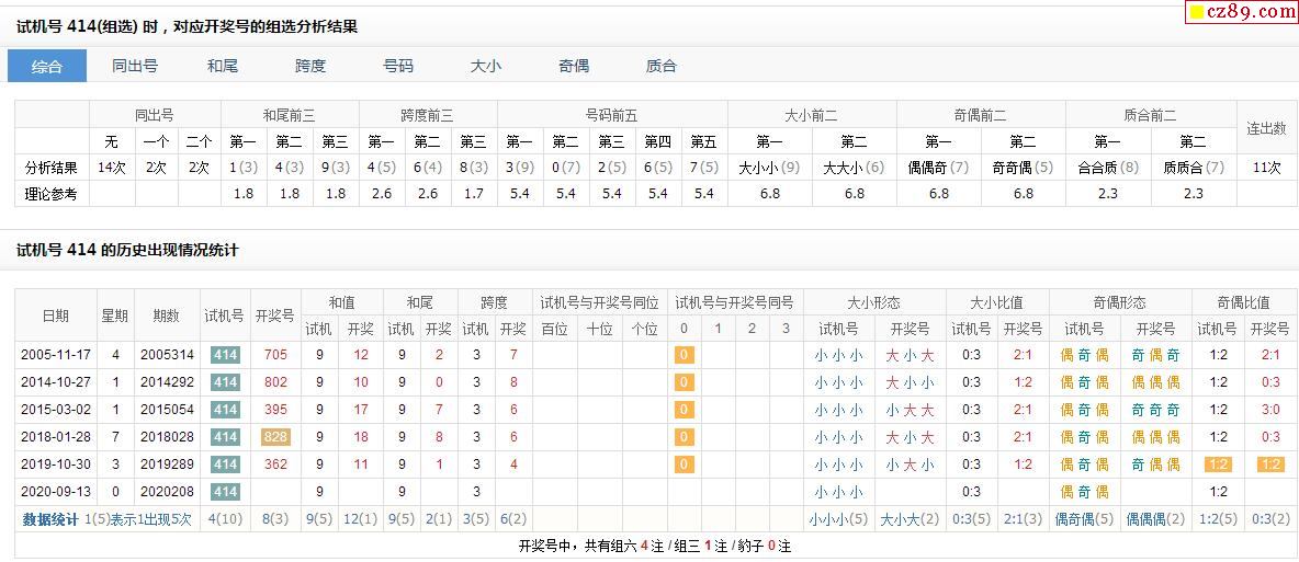208期福彩3D试机号414对应开奖号的组选分析结果